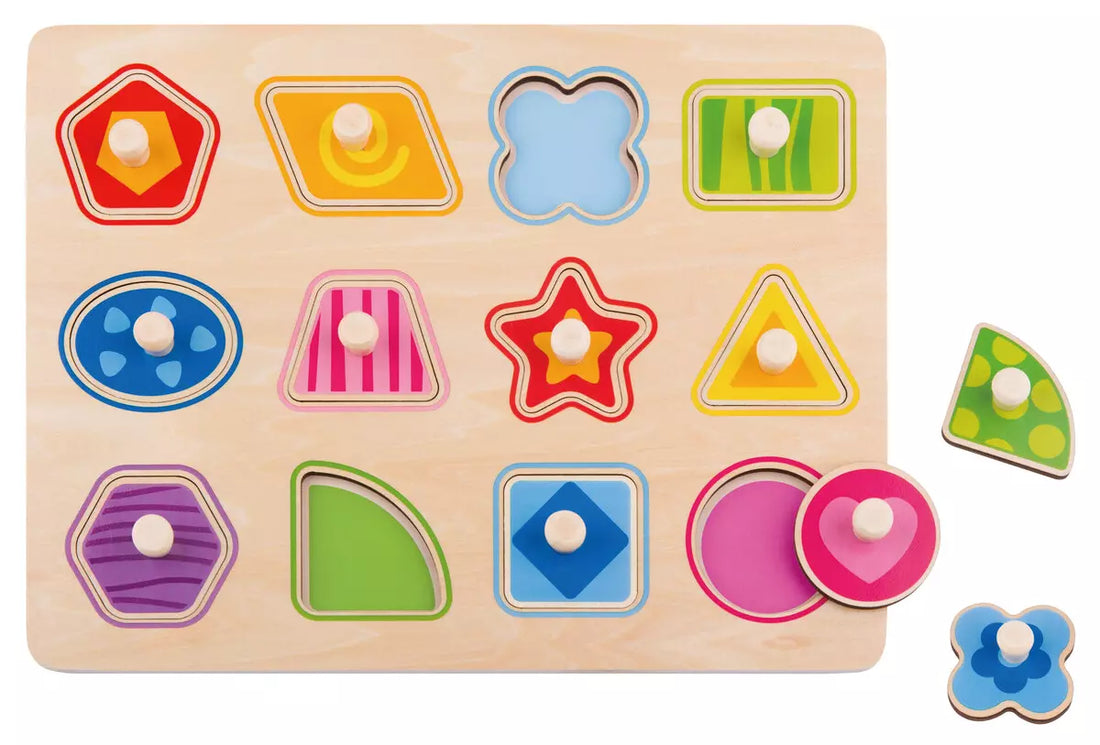 The Wooden Shape Peg Puzzle from Tooky Toys is designed for small children to learn...