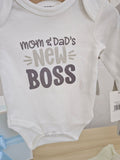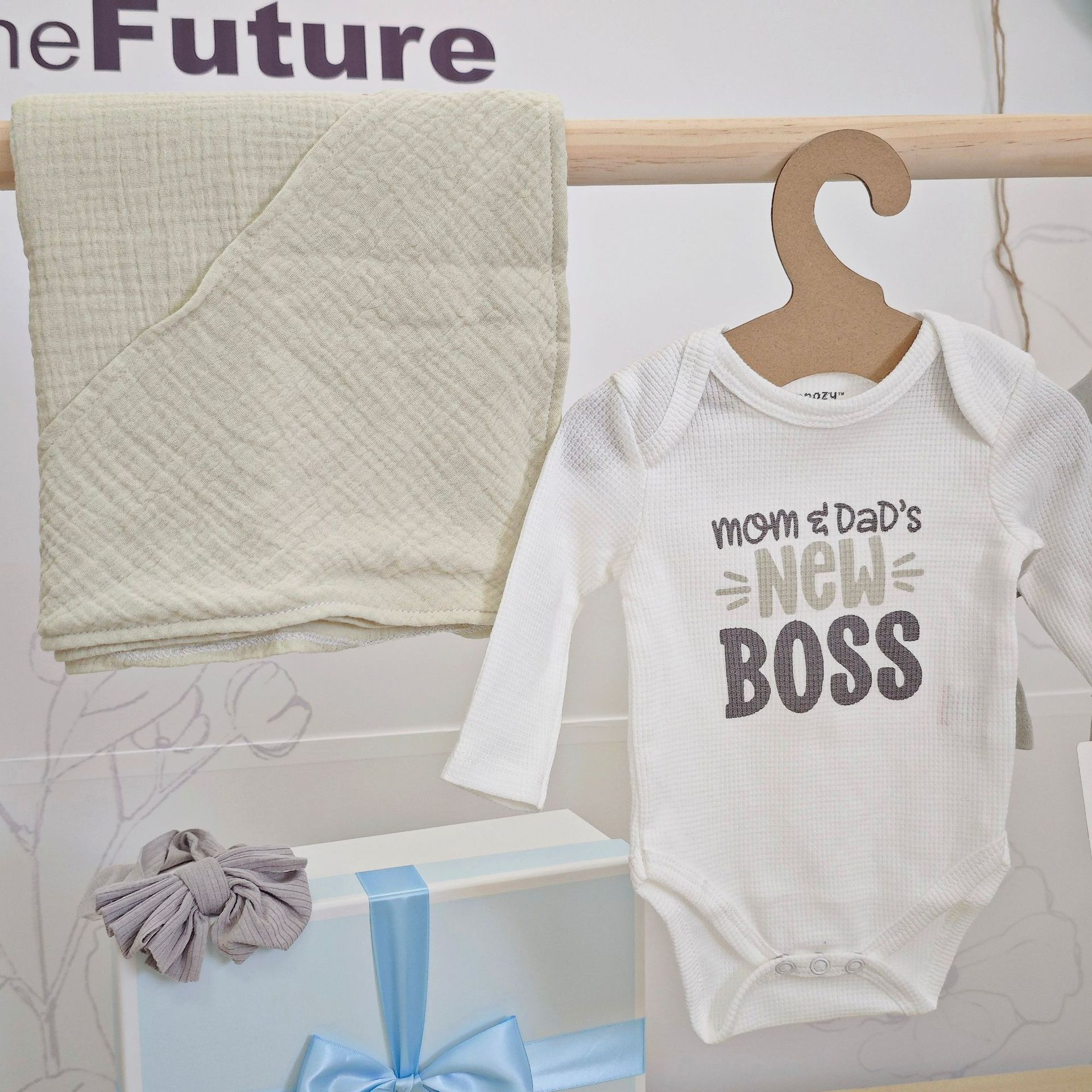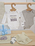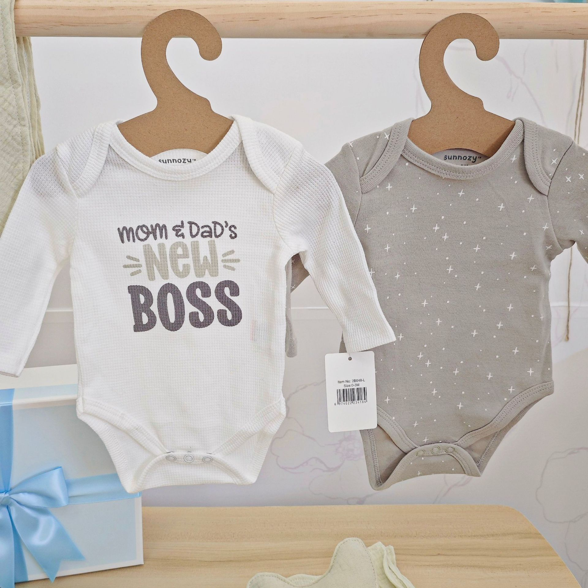 2 Long-Sleeve Bodysuits – One in classic white with the fun slogan “Mom & Dad’s New Boss” and one in soft grey with starry details.
