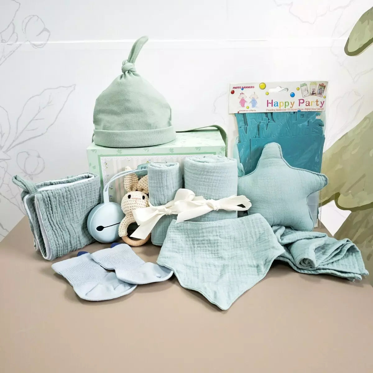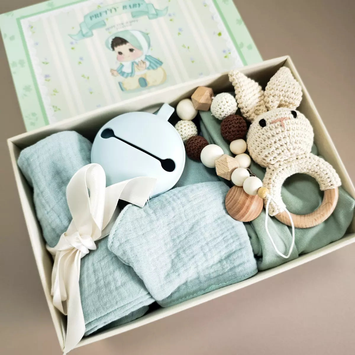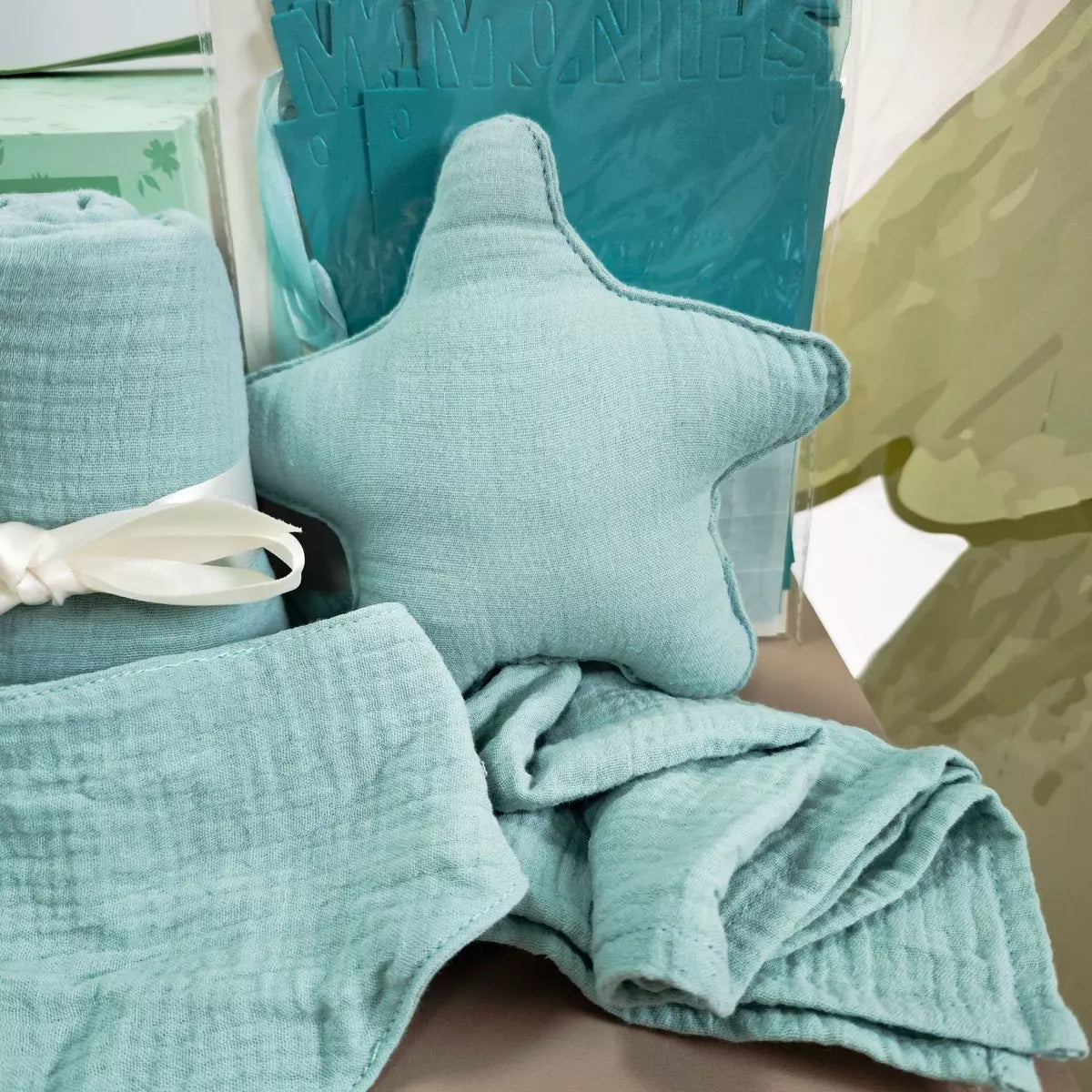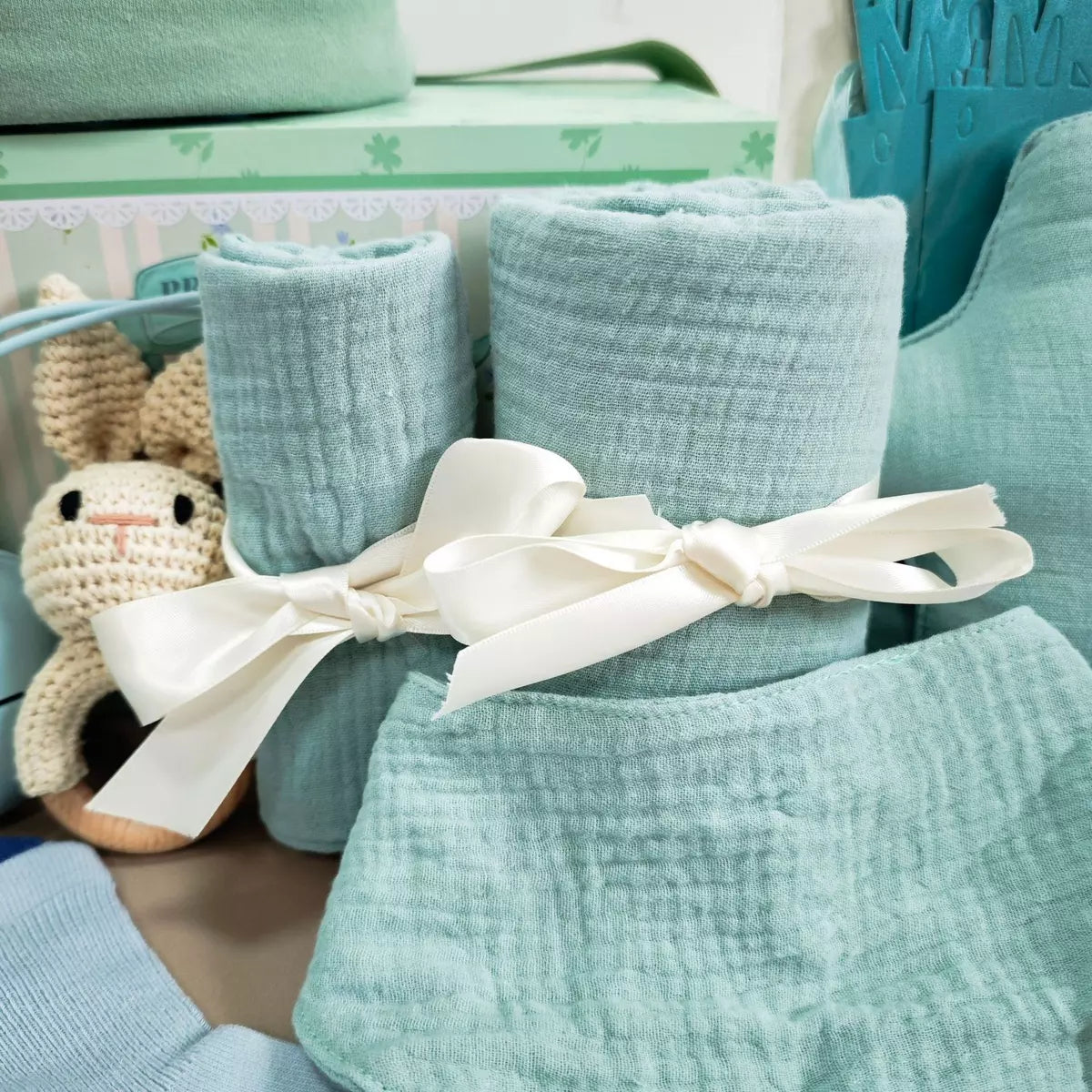 Welcome a little one with this thoughtfully curated Baby Gift Set in soothing mint tones — a perfect blend of practicality and charm. Designed with comfort and everyday use in mind, this bundle includes soft muslin essentials and playful accessories that parents will love and babies will enjoy.