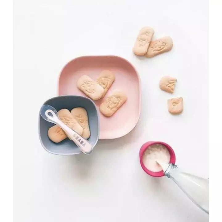 A set of silicone dishes from the French brand BEABA consists of a plate, a bowl, a mug and a training spoon. All elements of the set are characterized by an ergonomic, rounded shape and soft, smooth edges.