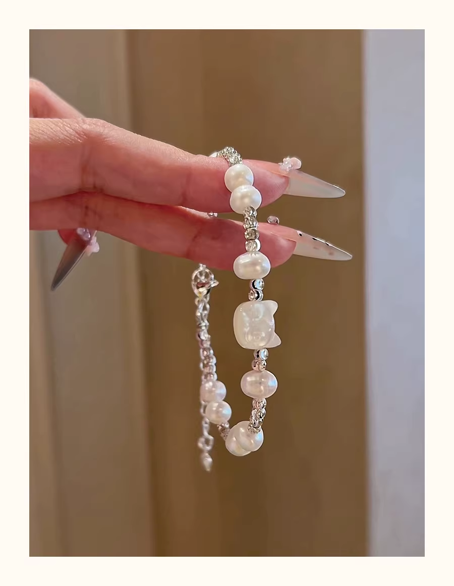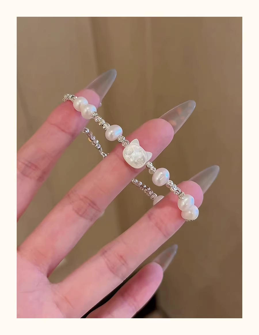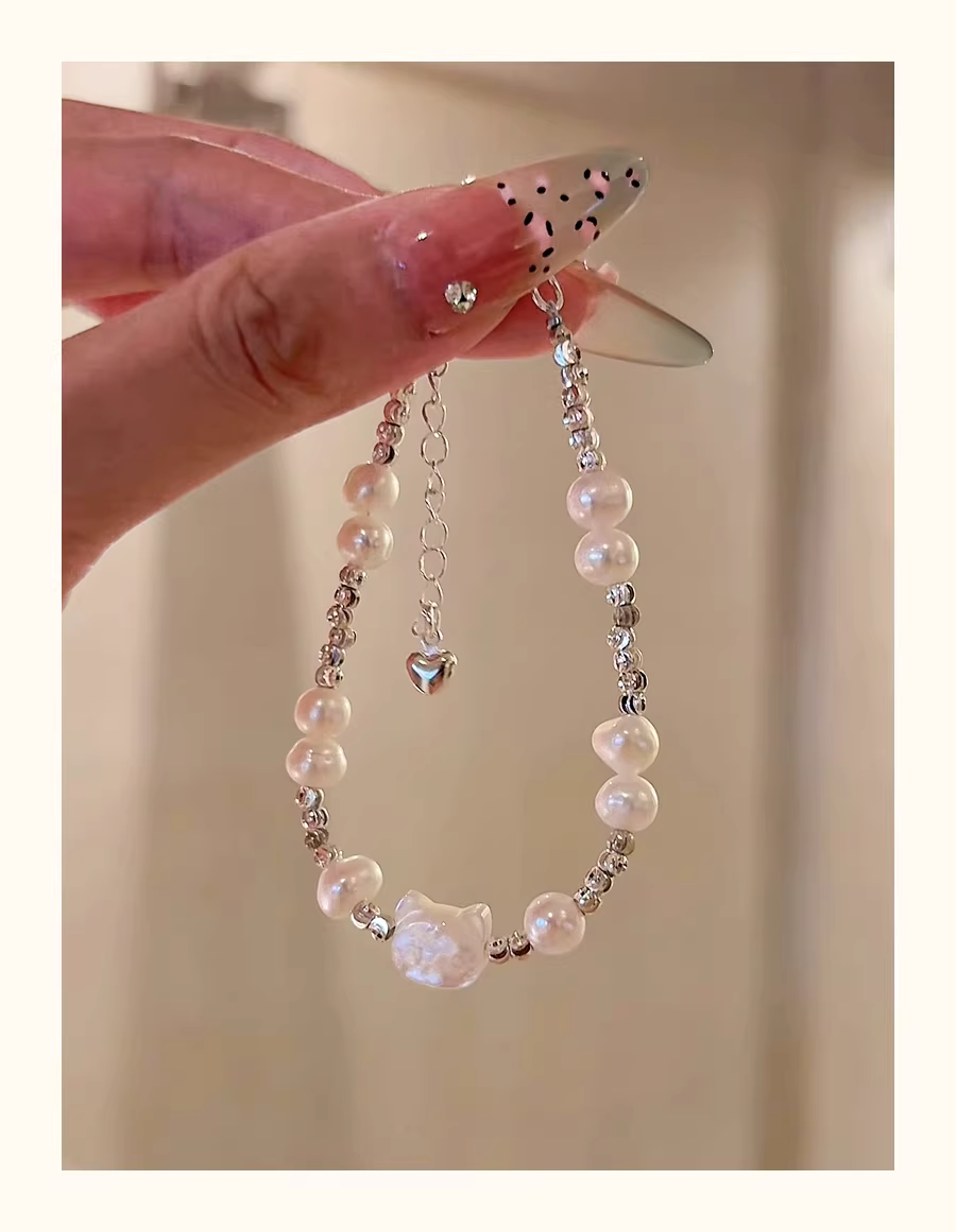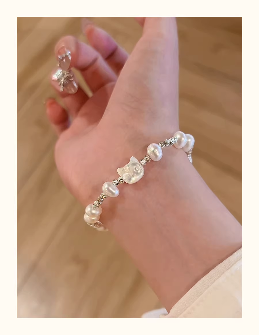 Handmade Cat Pearl Bracelet – Natural Freshwater Pearls, Cute Minimal Design
