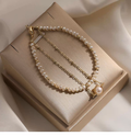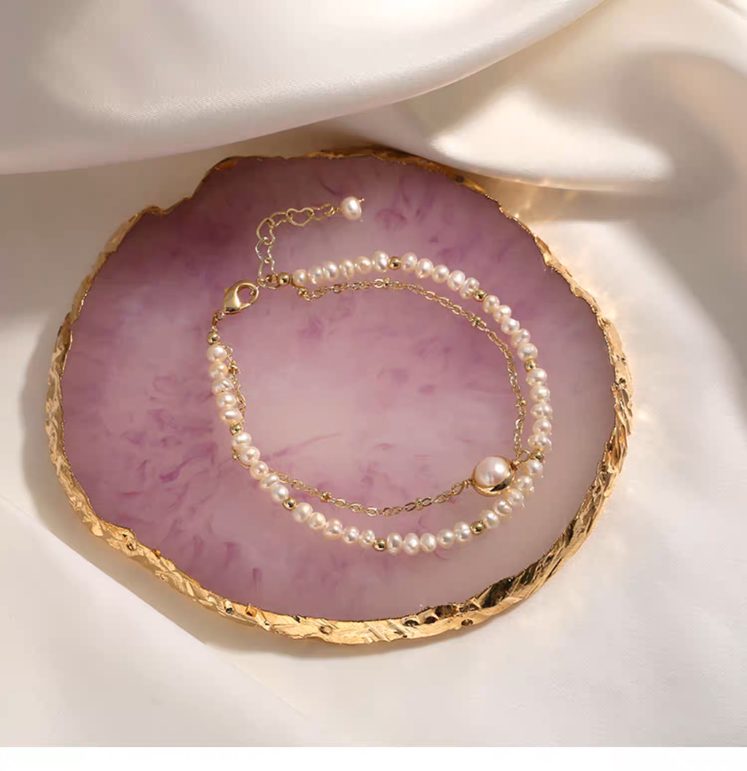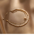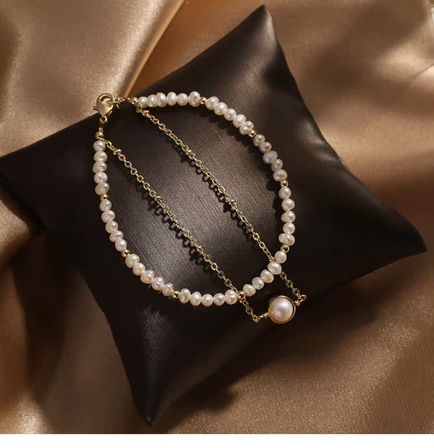 This handmade double layer bracelet features natural freshwater pearls paired with a delicate 14K gold plated chain, creating a soft yet elegant layered look. Each pearl is carefully selected and hand-strung to highlight its natural luster and organic beauty, offering a refined balance between classic and modern style.