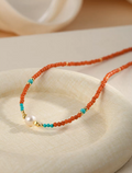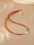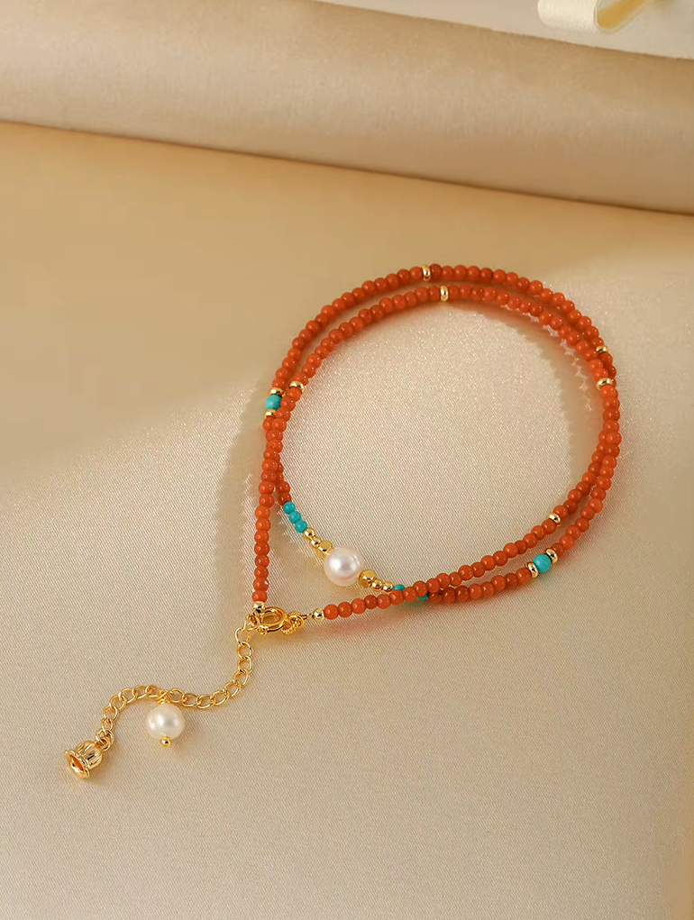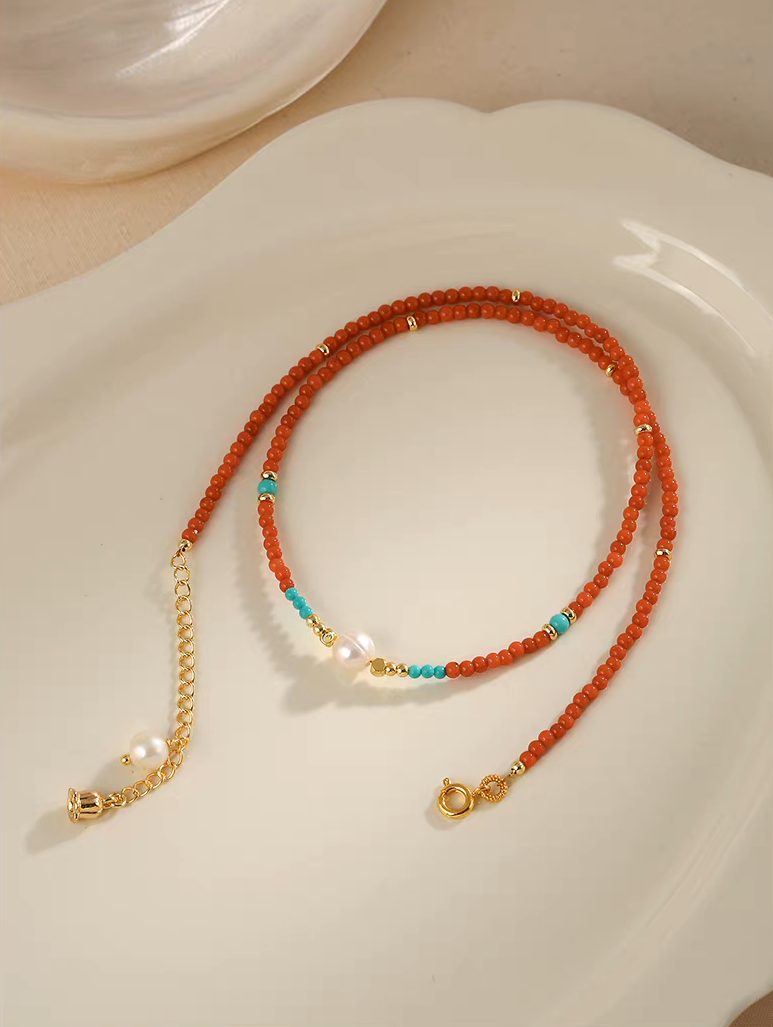 This handmade beaded necklace features rich red agate beads paired with natural freshwater pearls and subtle turquoise accents, creating a refined balance between warmth and elegance. The minimalist silhouette is elevated by carefully spaced pearls, adding a soft feminine glow to the design.