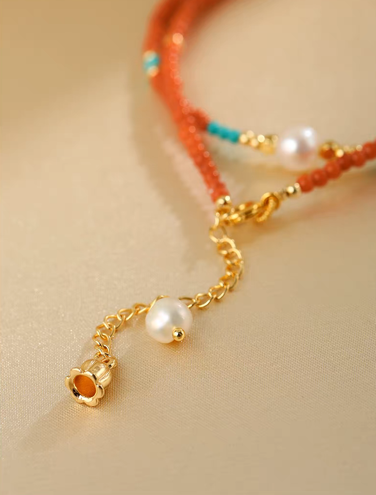 Material: Natural Red Agate, Freshwater Pearls, Turquoise, Alloy (14K Gold Plated)