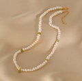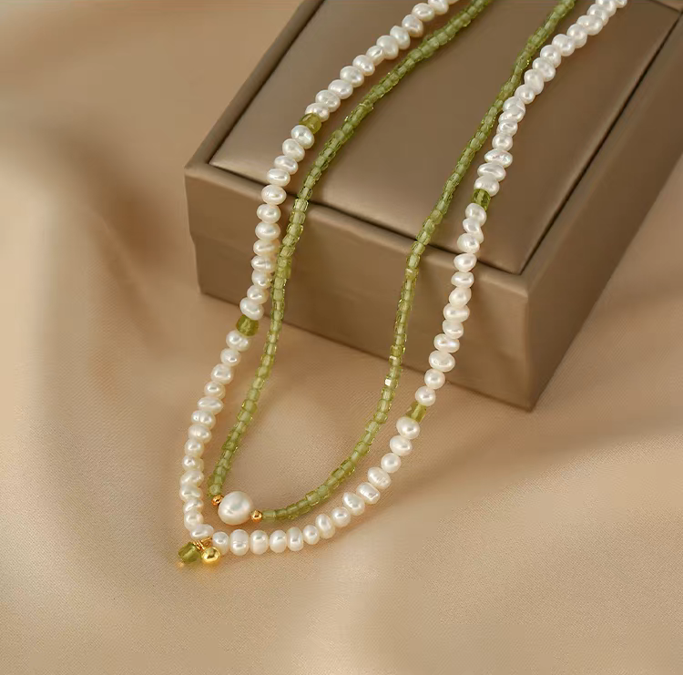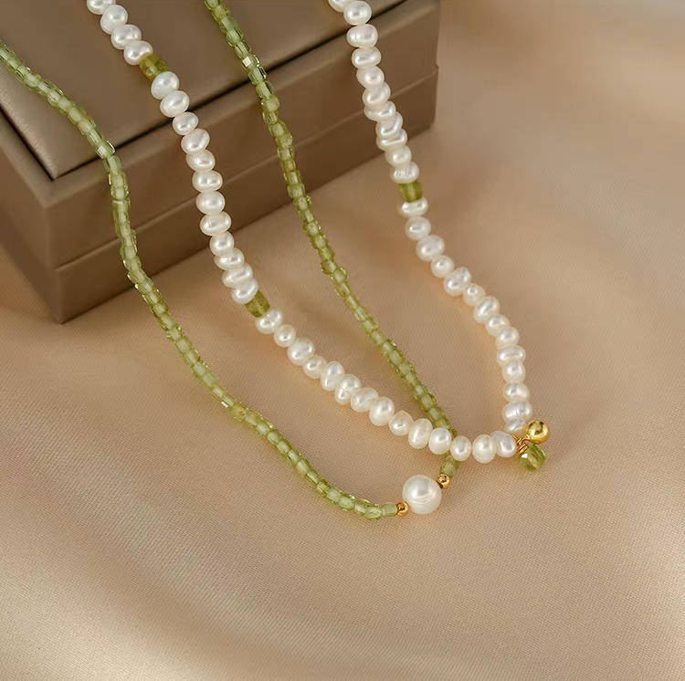This handmade layered necklace features natural freshwater pearls paired with soft green peridot beads, creating a fresh yet elegant look. Each bead is carefully selected and hand-strung, giving the necklace a refined texture and a subtle artisanal feel. The double-layer design adds dimension while remaining light and effortless.