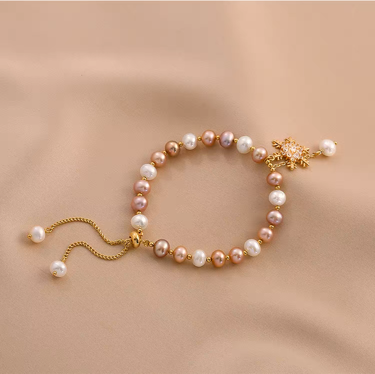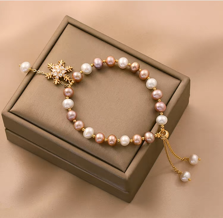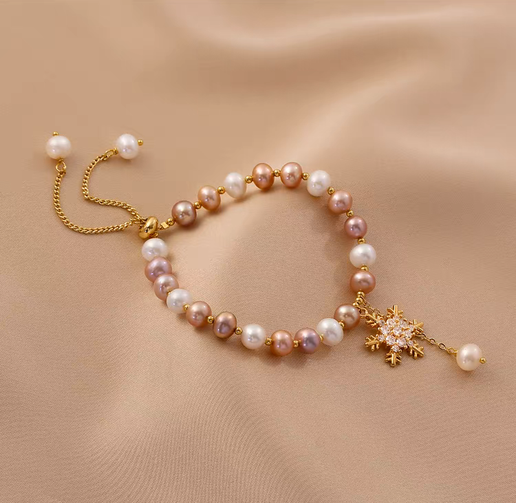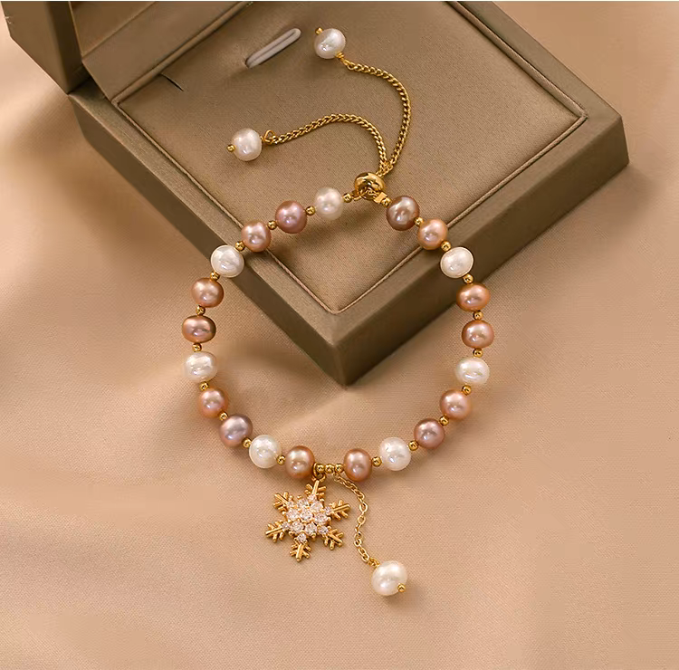 This handmade snowflake pearl bracelet features natural freshwater pearls in soft, irregular baroque shapes, accented with a delicate snowflake charm for a subtle festive touch. Each pearl is carefully selected and hand-strung to highlight its natural luster and organic beauty, creating a refined yet playful design.