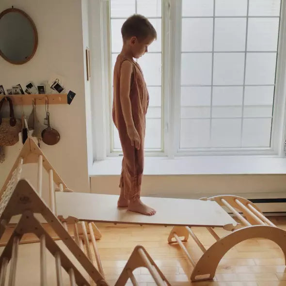 Through active developmental play with the pikler system, children can strengthen their balance and coordination, improve gross motor skills, gain physical and cardiovascular strength, build self-esteem, enjoy creative expression, and explore their boundless imagination.