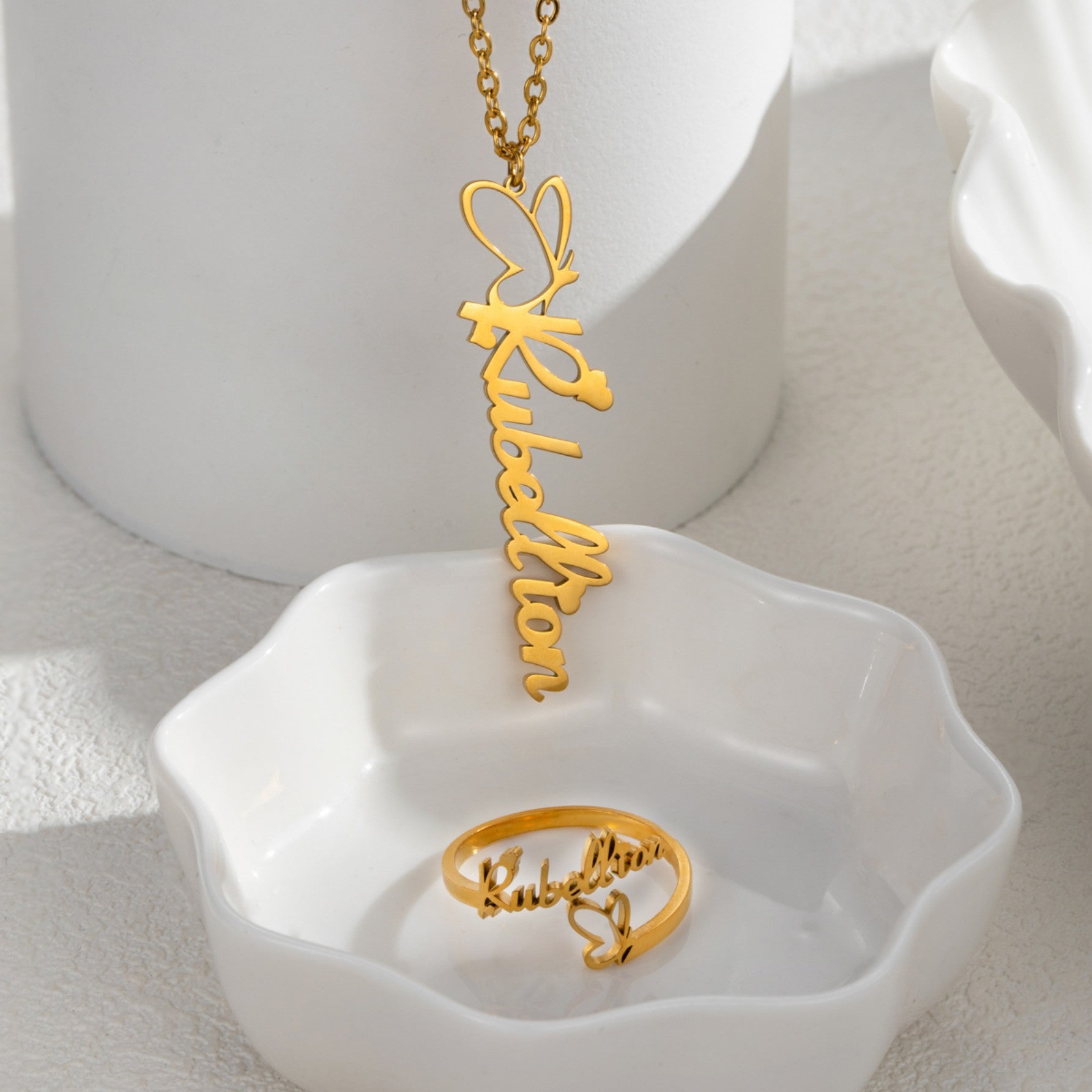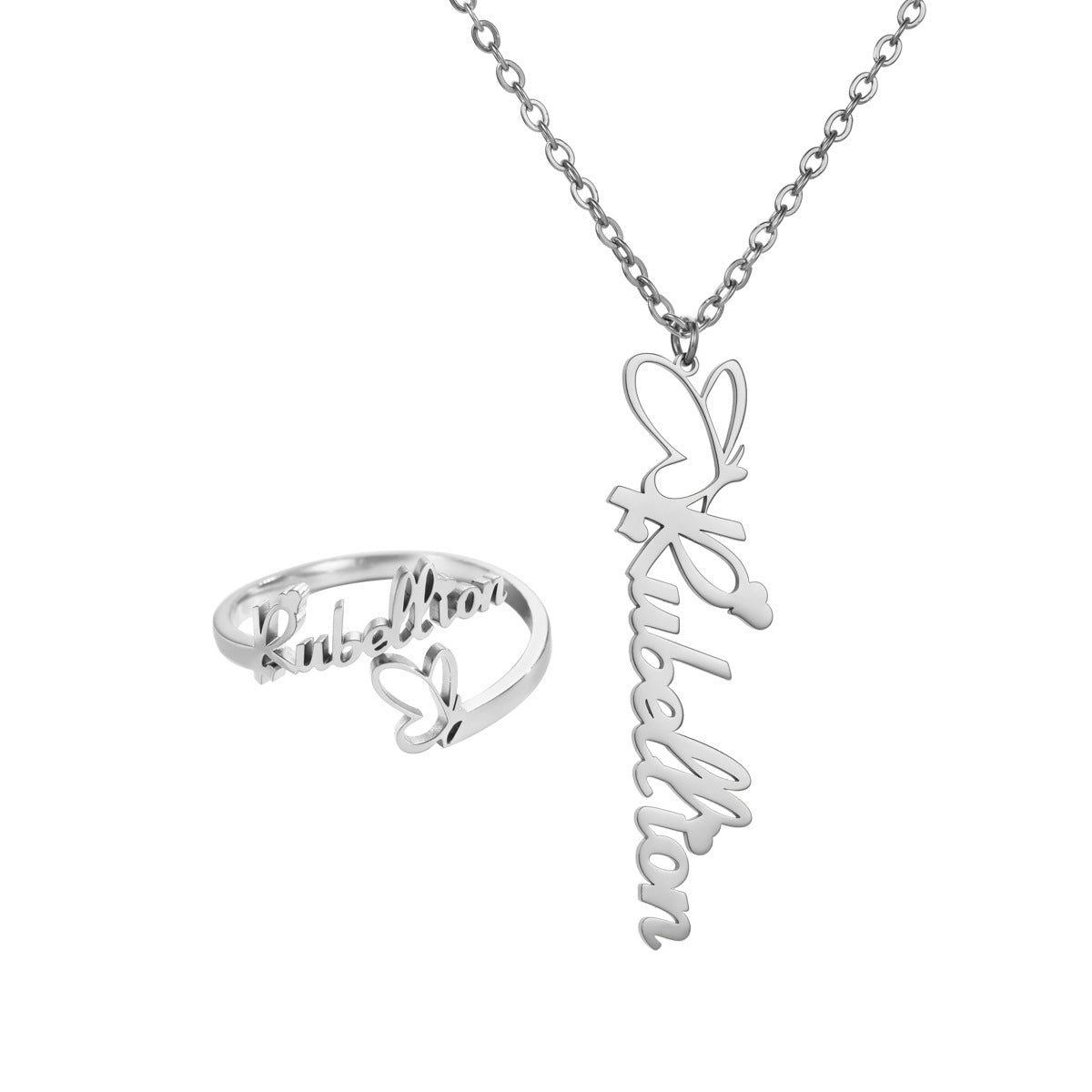 Delicate, meaningful, and full of charm — this personalised butterfly name necklace and ring set captures the beauty of transformation and individuality. Each piece features a graceful butterfly motif paired with your custom engraved name, making it a heartfelt expression of love and self-confidence.
