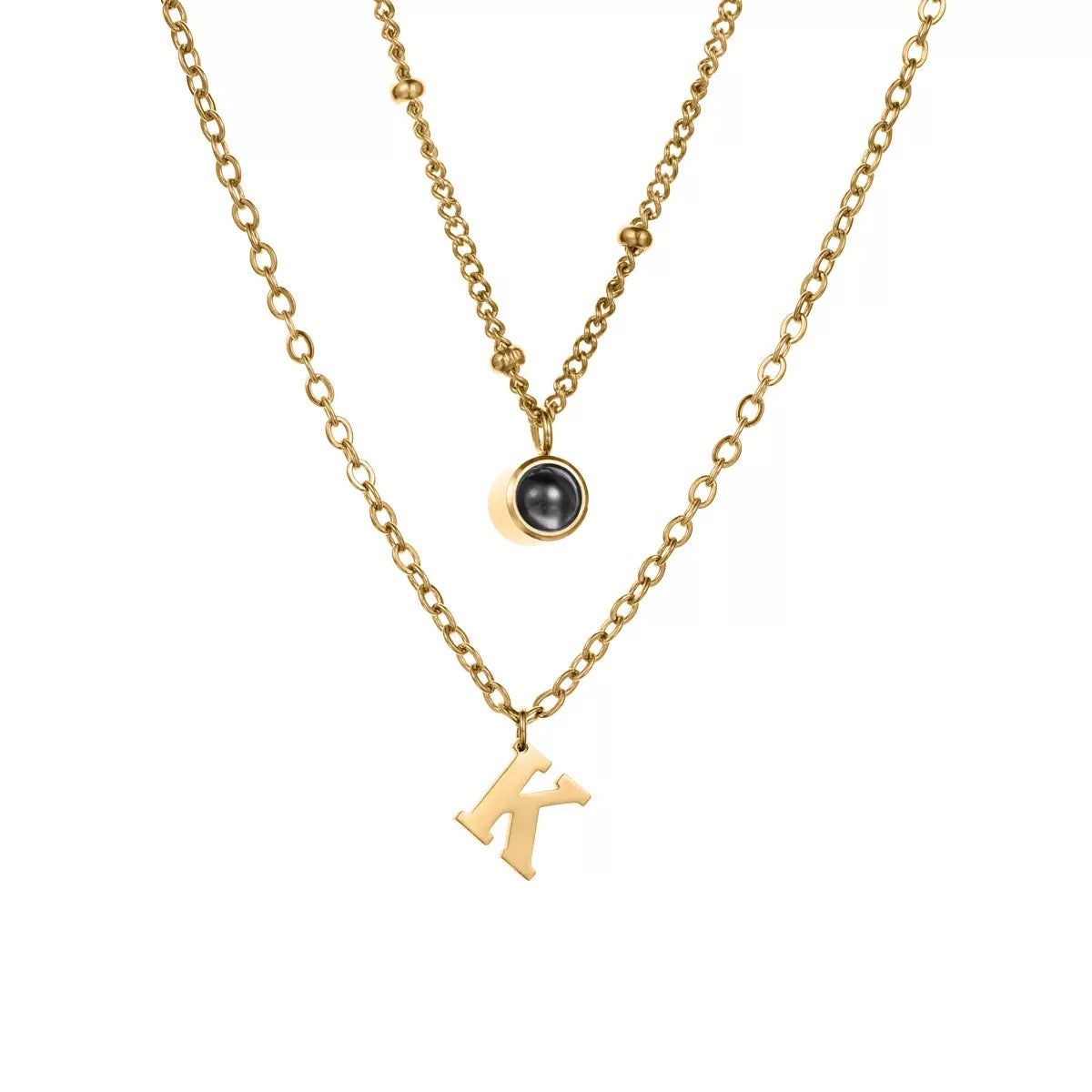 This necklace features a stylish double-layer design, combining a personalised initial charm with a discreet photo projection pendant. Inside the projection stone, a special photo of your choice is carefully embedded — creating a unique keepsake that reveals a cherished moment when viewed up close or under light.