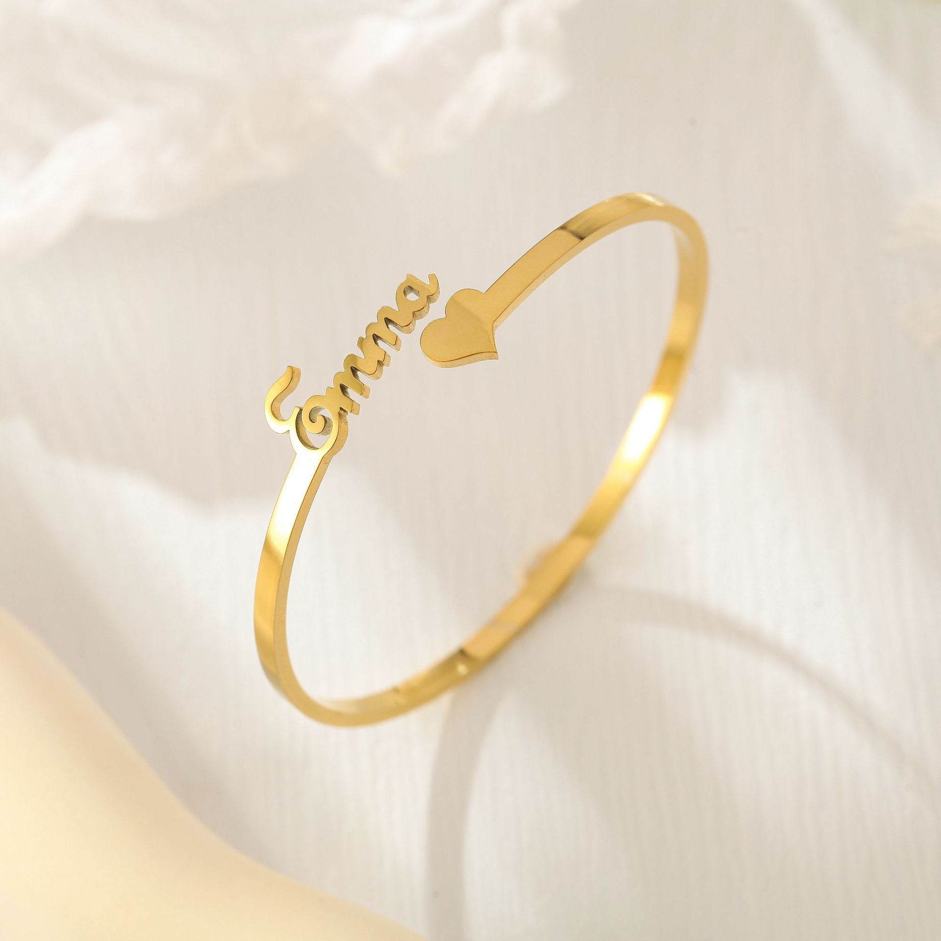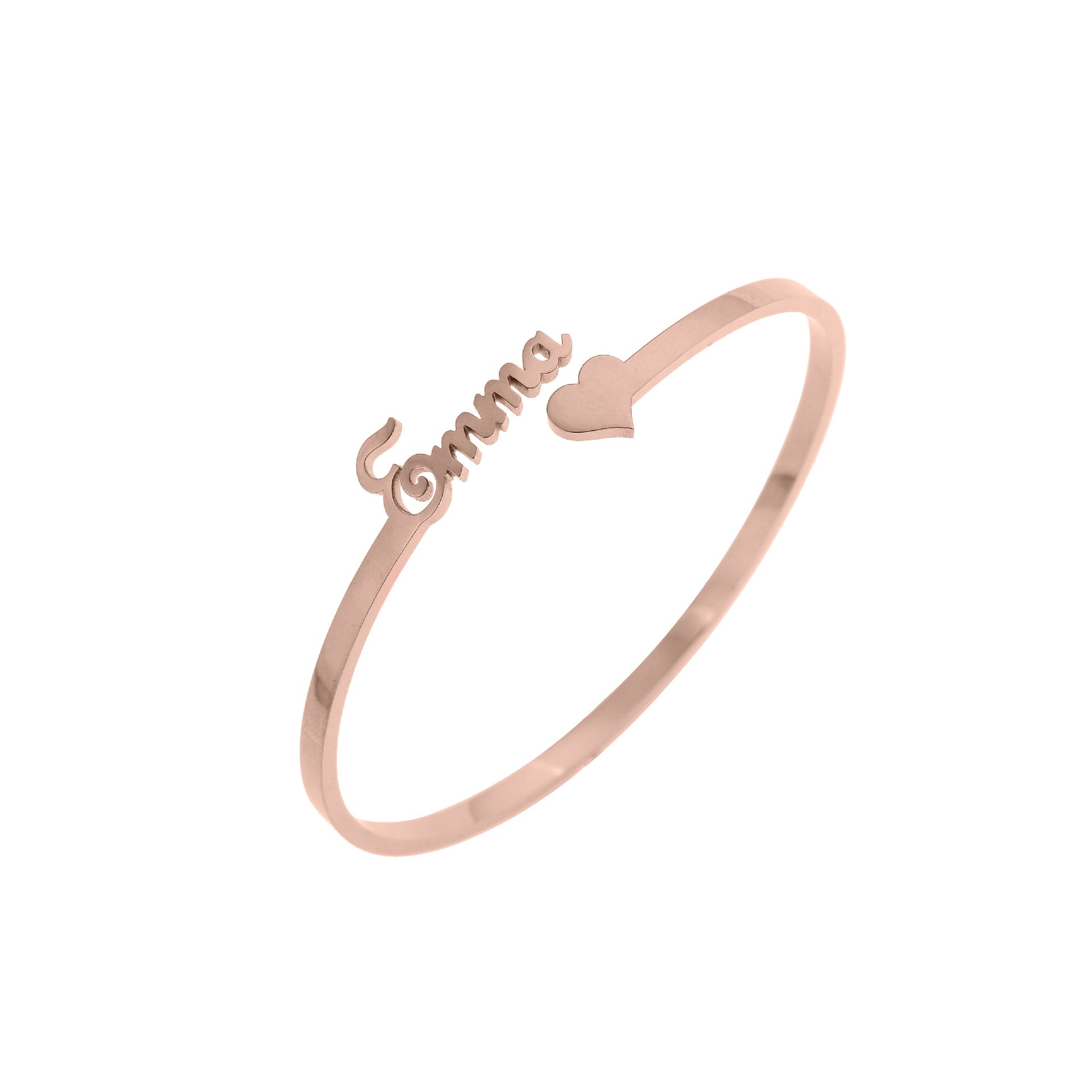 Elegant and timeless, this personalised heart name bangle is the perfect way to celebrate love, friendship, or self-expression. Beautifully crafted with a delicate heart accent beside your custom name engraving, it makes a thoughtful and meaningful accessory for any occasion.