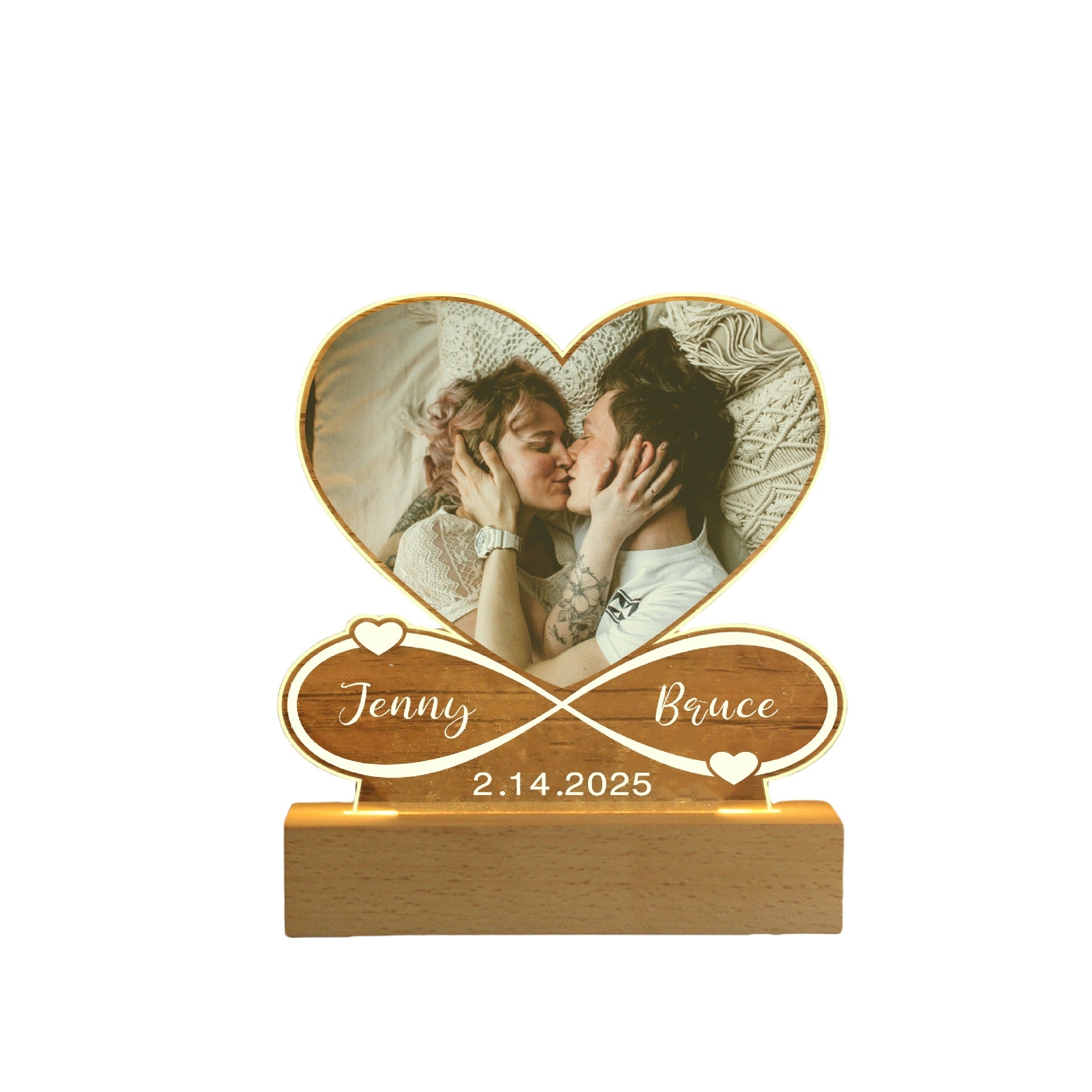 Set on a stylish wooden base, the soft LED glow brings your photo to life, turning a special memory into a timeless keepsake. Add your names, a date, or a sweet message to make it uniquely yours.