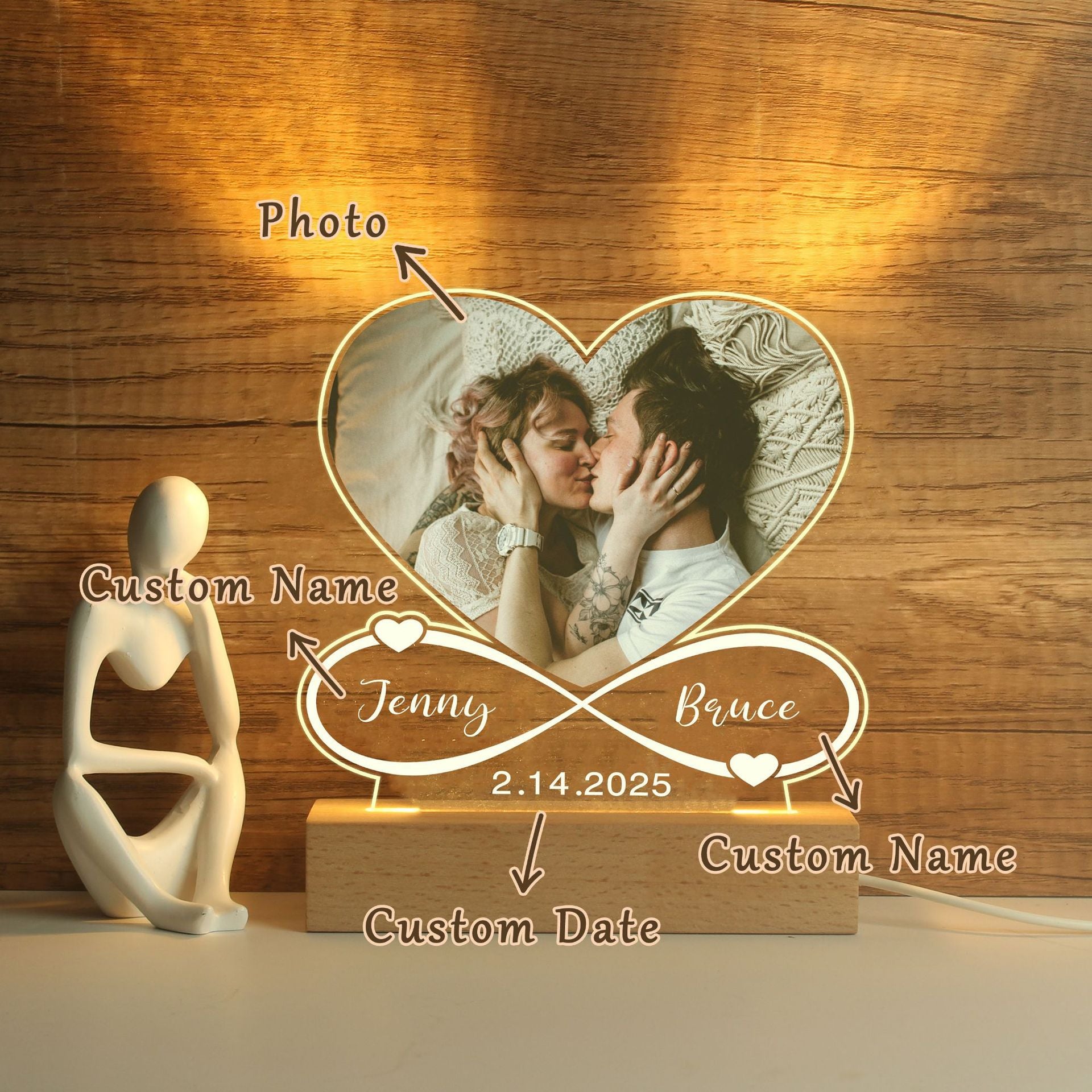 Celebrate your love with our Personalised Night Light, beautifully designed to capture your most cherished moment in a glowing heart-shaped display. Featuring your custom photo engraved or printed within the heart, this night light creates a warm, romantic ambiance perfect for bedrooms, anniversaries, or as a heartfelt gift.