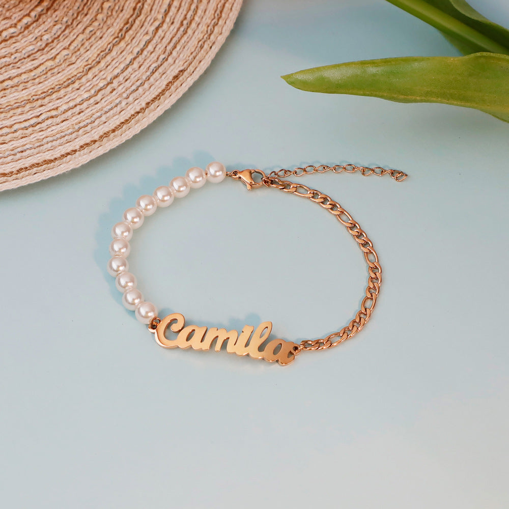 Celebrate personal style with this elegant personalised name bracelet—designed with a unique half-and-half look combining classic pearls on one side and a modern chain on the other. The custom cut-out nameplate adds a meaningful touch, turning this piece into a truly one-of-a-kind accessory.