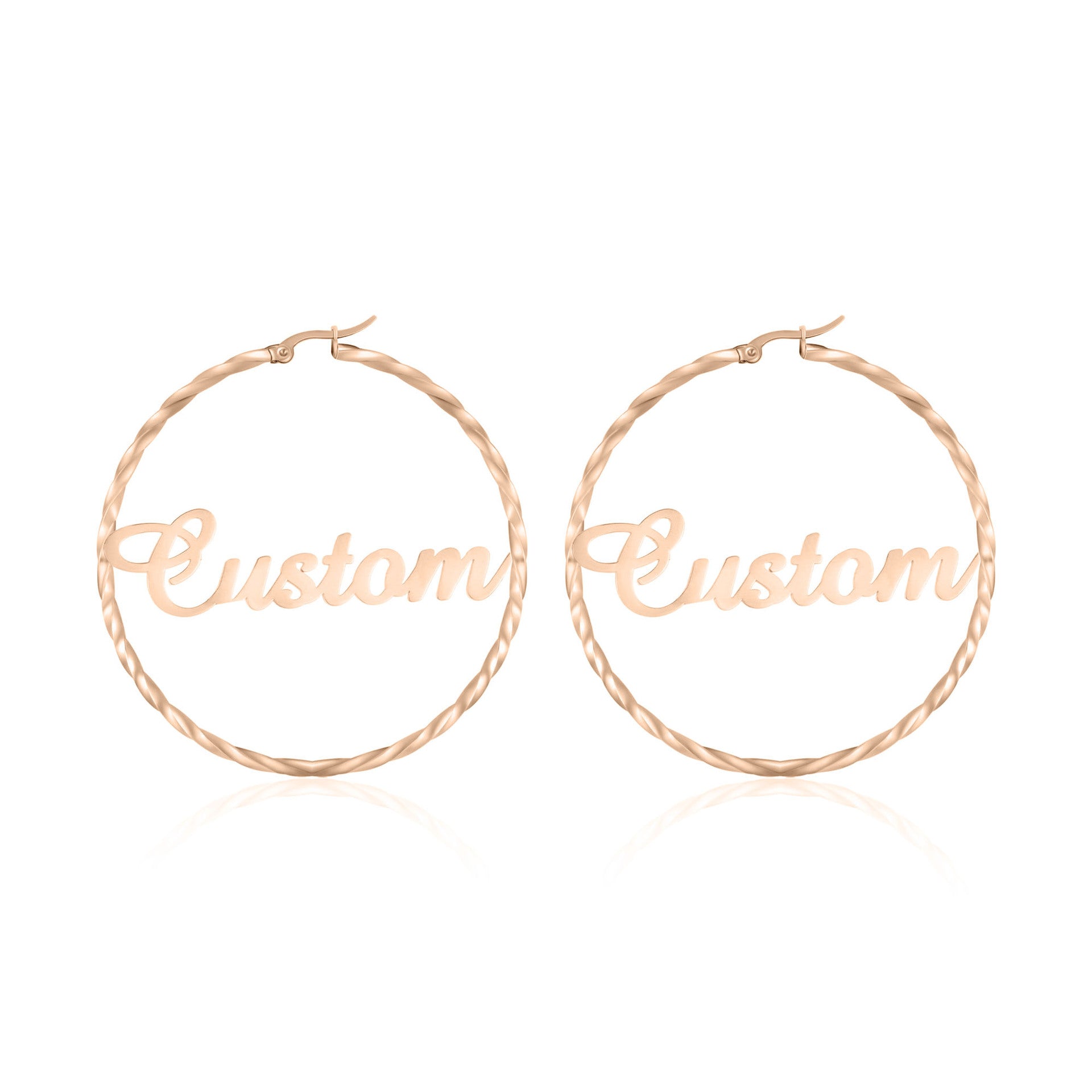 Make a bold statement with these custom name hoop earrings, designed in a beautiful twisted rope circle. Each pair is individually crafted from high-quality stainless steel and features your chosen name or word in elegant script lettering — perfect for everyday wear or as a meaningful personalised gift.