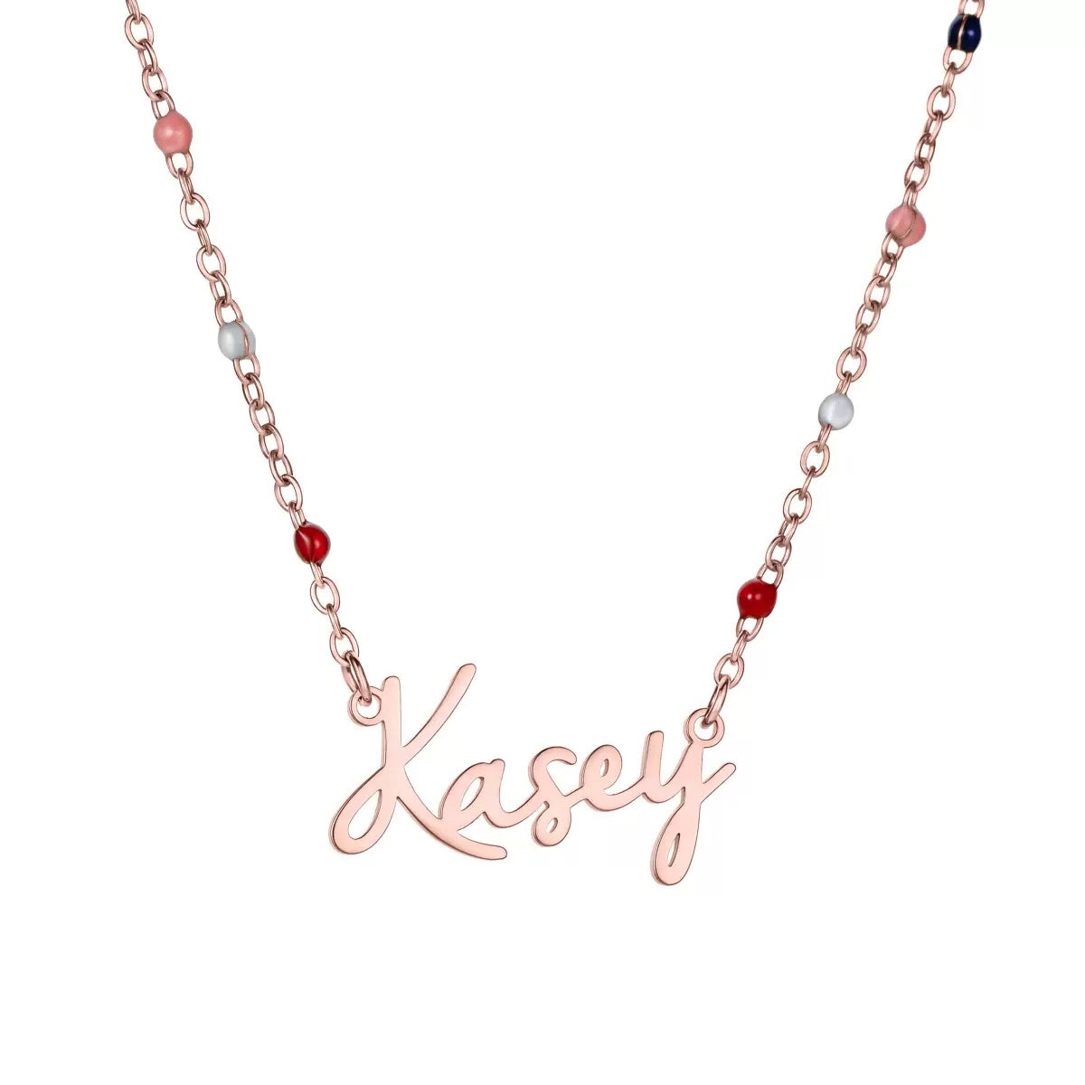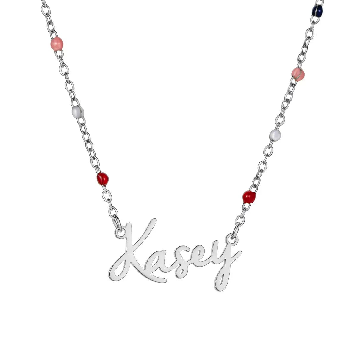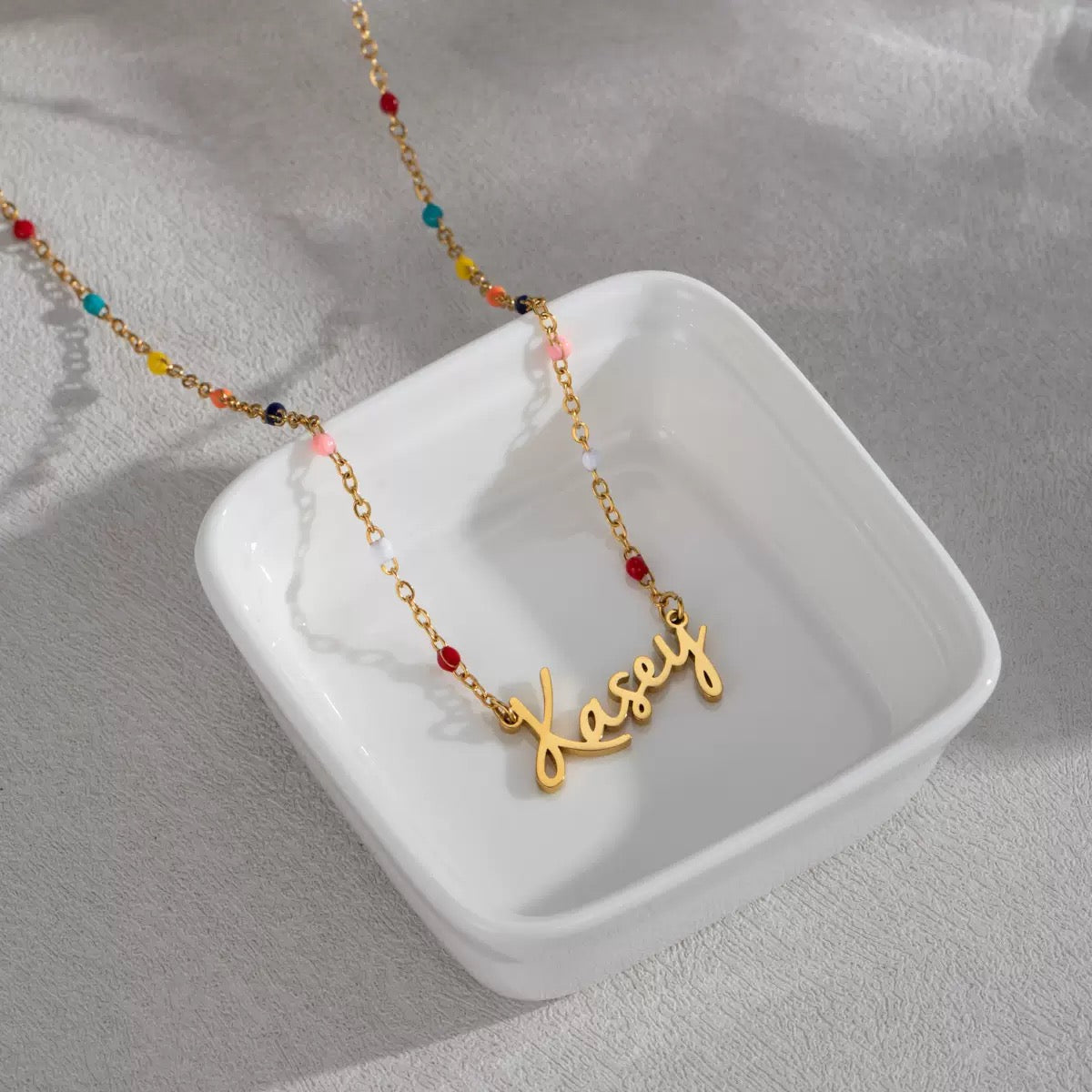 Each necklace features a delicate chain adorned with subtle colourful beads, finished with a handwritten-style name charm customised just for you. Simple yet full of personality, this piece is perfect for expressing your own name or gifting someone special a thoughtful keepsake they’ll treasure.