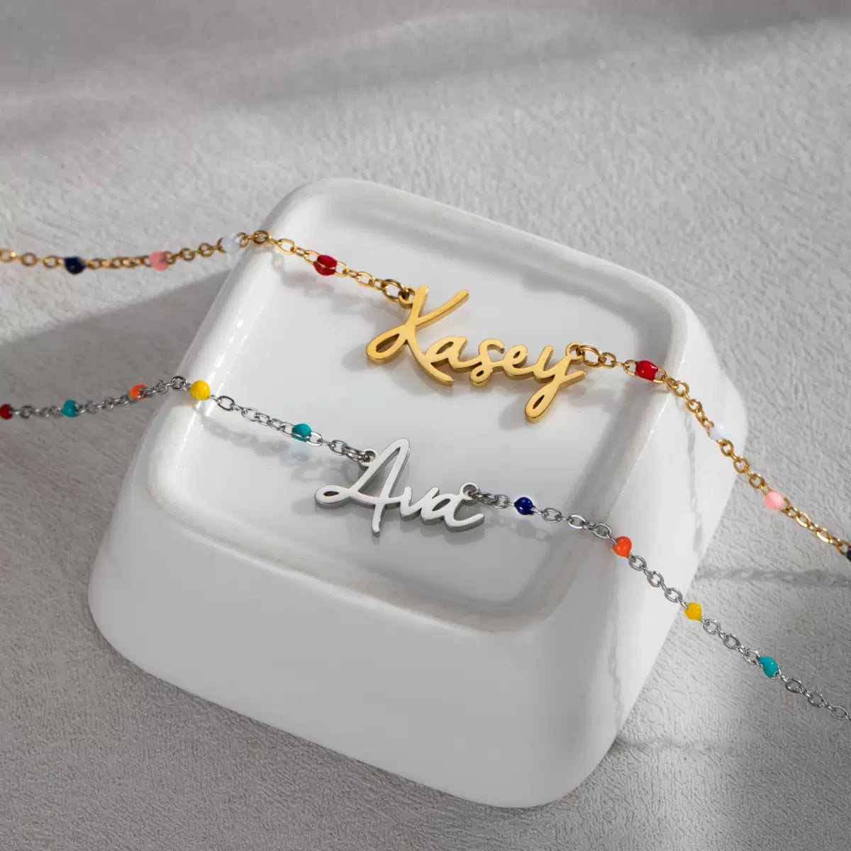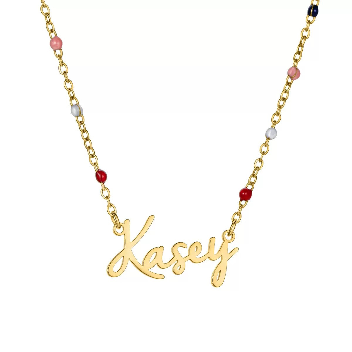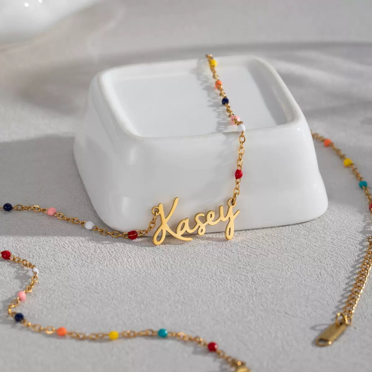 Each necklace features a delicate chain adorned with subtle colourful beads, finished with a handwritten-style name charm customised just for you. Simple yet full of personality, this piece is perfect for expressing your own name or gifting someone special a thoughtful keepsake they’ll treasure.