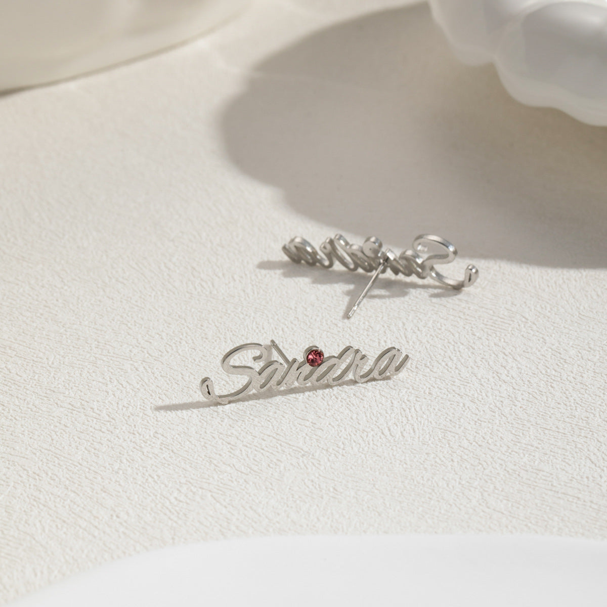 Celebrate individuality with these elegant custom name stud earrings, accented with a sparkling birthstone of your choice. Each earring is delicately crafted from high-quality stainless steel, featuring your chosen name in graceful cursive script and a gemstone that represents your birth month or zodiac sign.