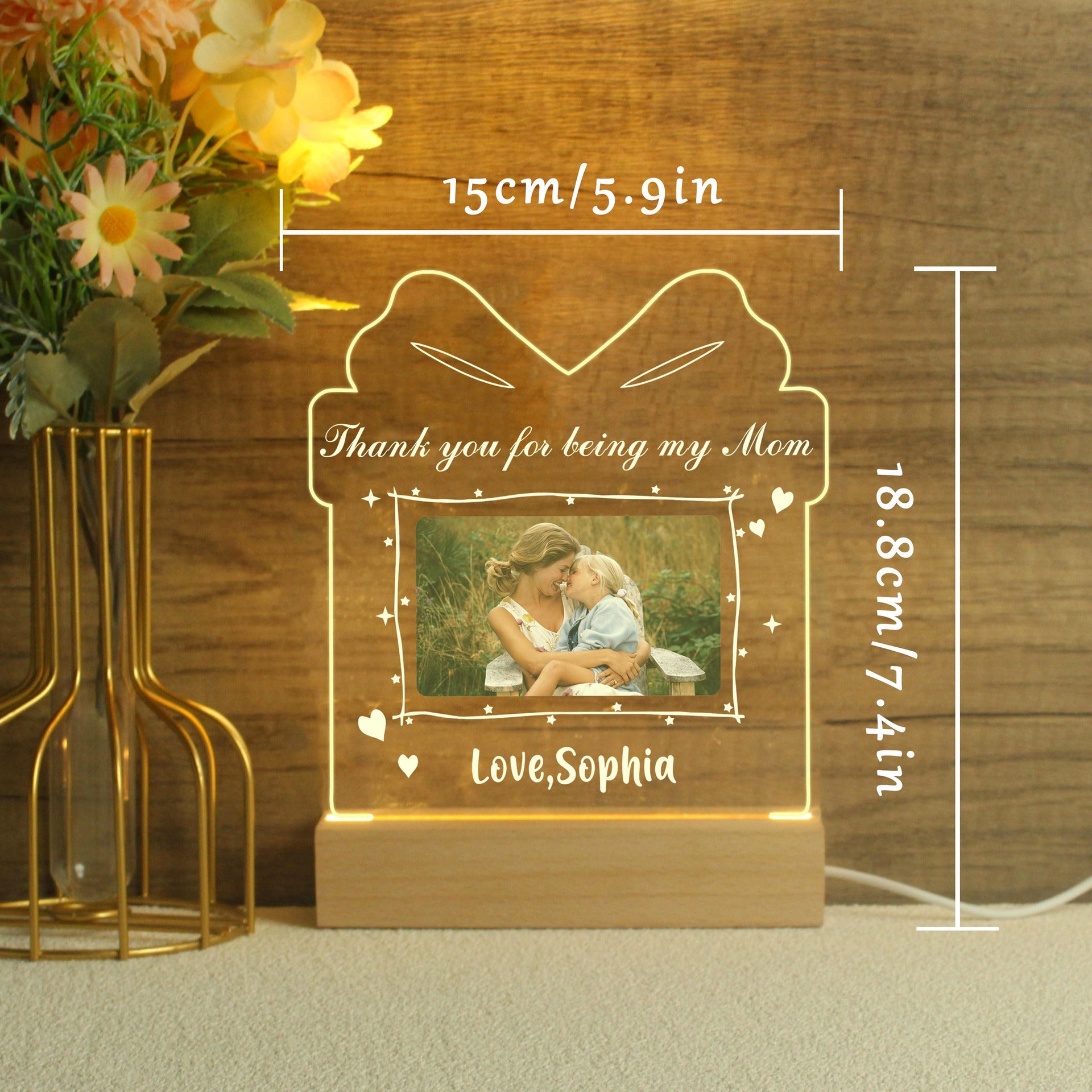 Set on a stylish wooden base, the soft LED glow brings your photo to life, turning a special memory into a timeless keepsake. Add your names, a date, or a sweet message to make it uniquely yours.