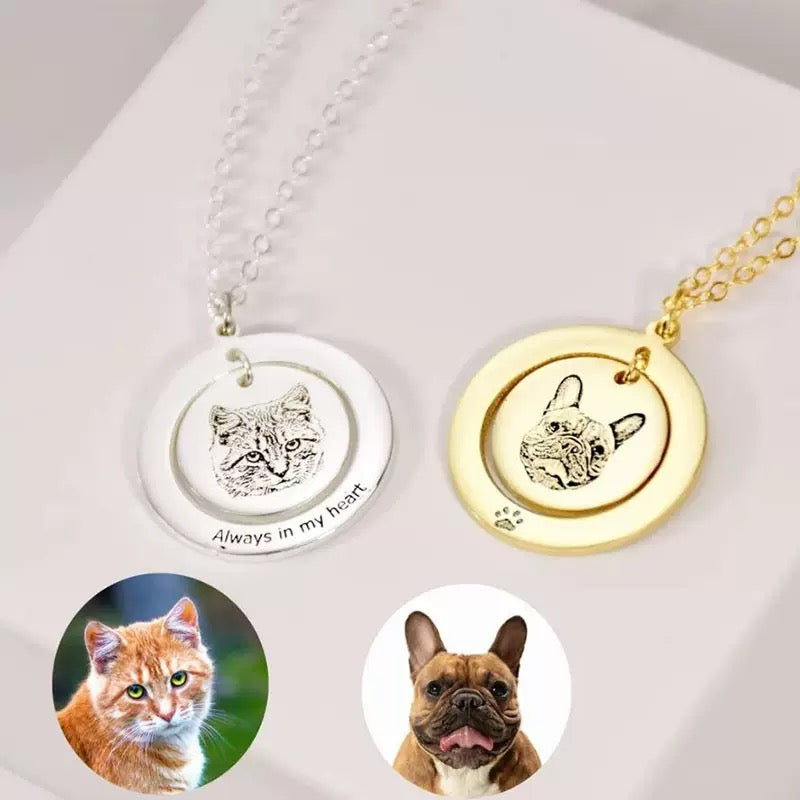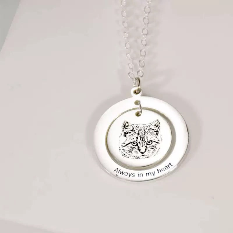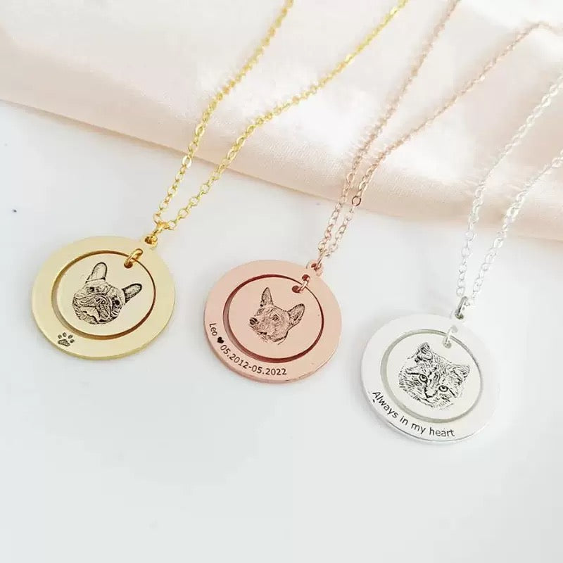 Featuring a layered round pendant, this personalised necklace combines a custom engraved pet portrait with optional name, dates, or a short message, creating a timeless piece filled with sentiment. Whether worn as a daily reminder or a gentle tribute, it’s a beautiful way to celebrate the bond that never fades.