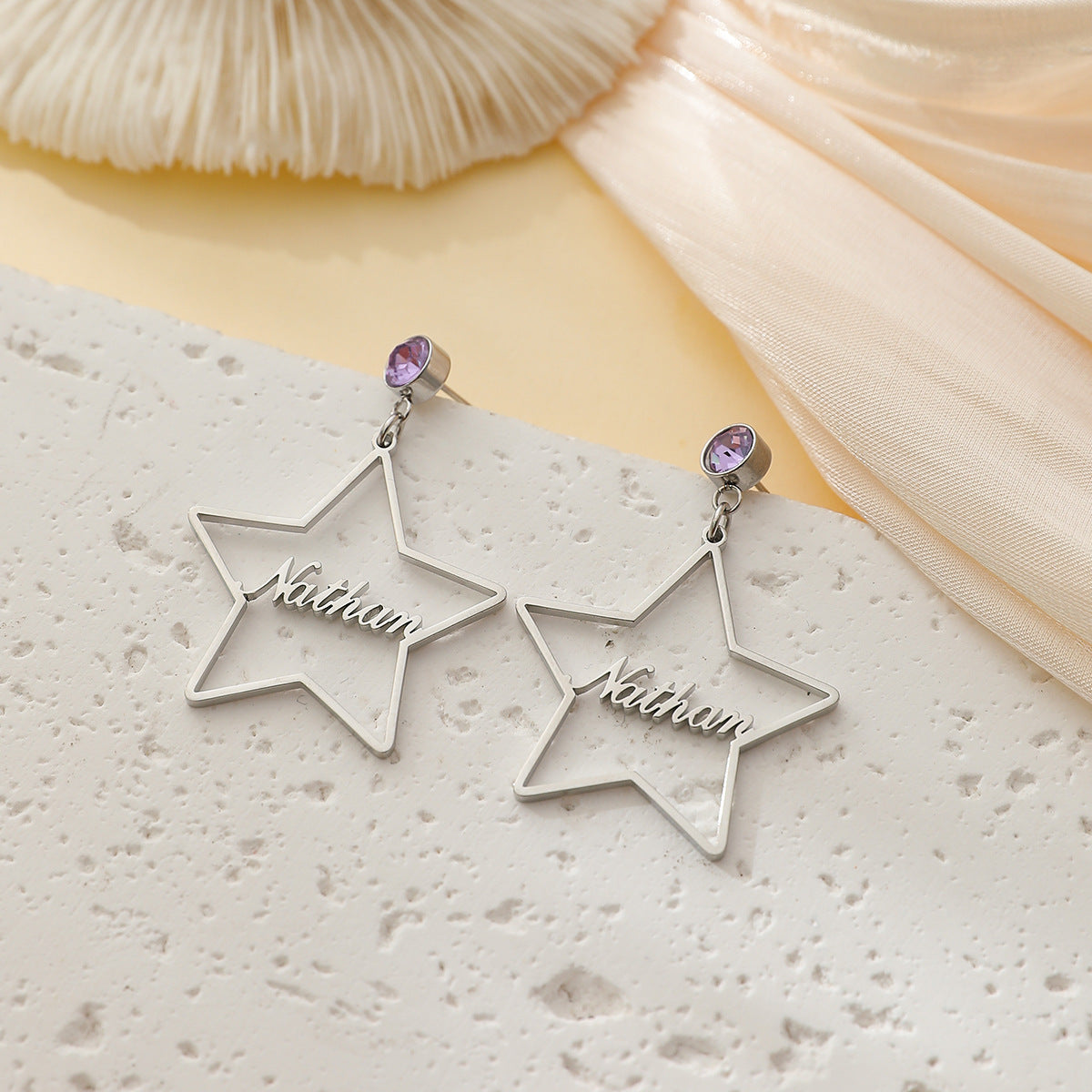 Personalised Star Name Earrings with Birthstone – Custom Drop Earrings