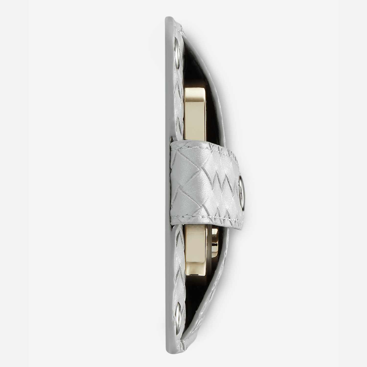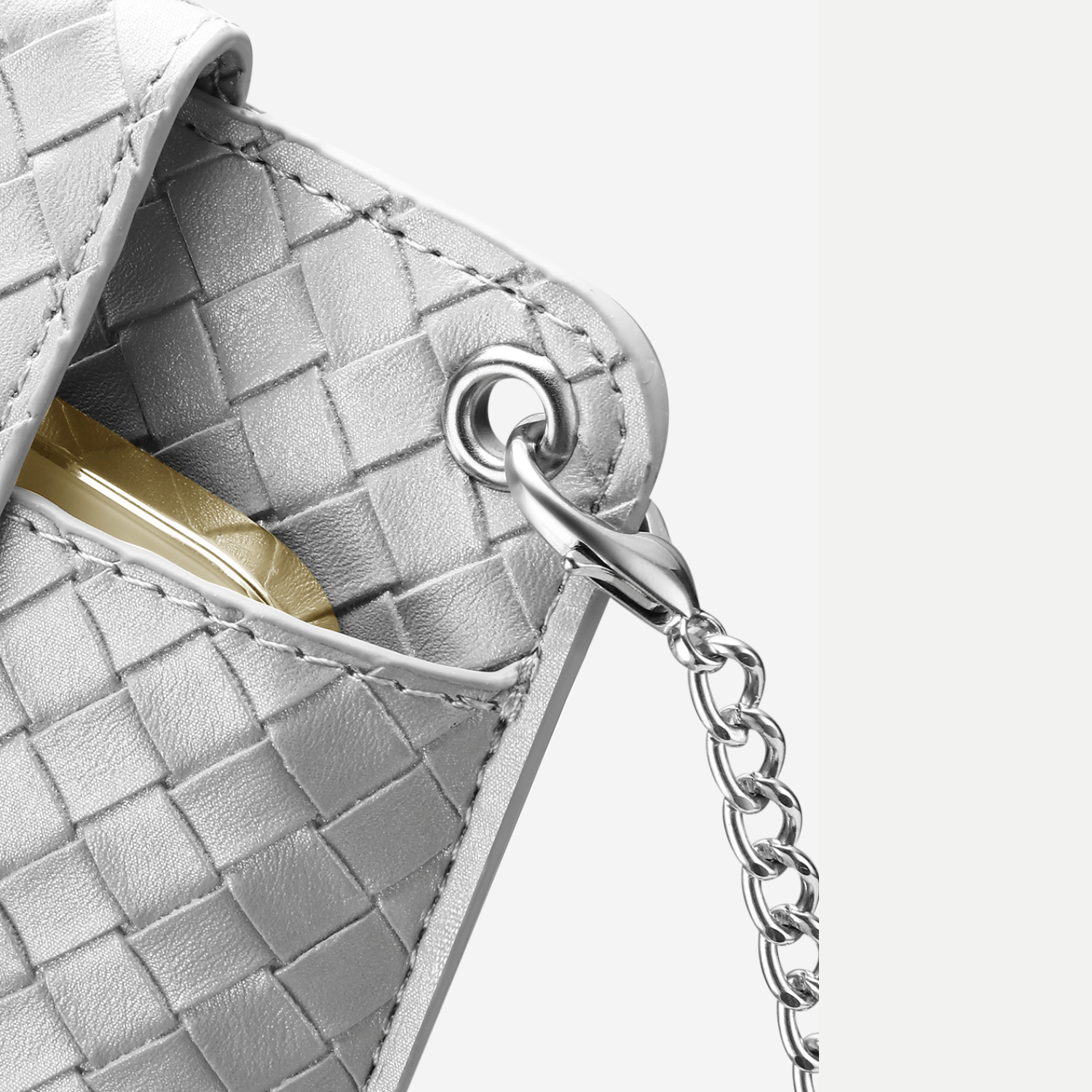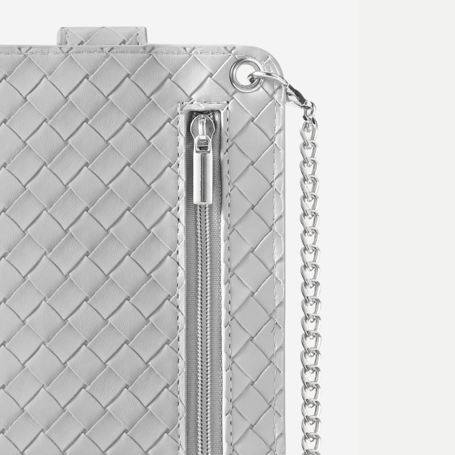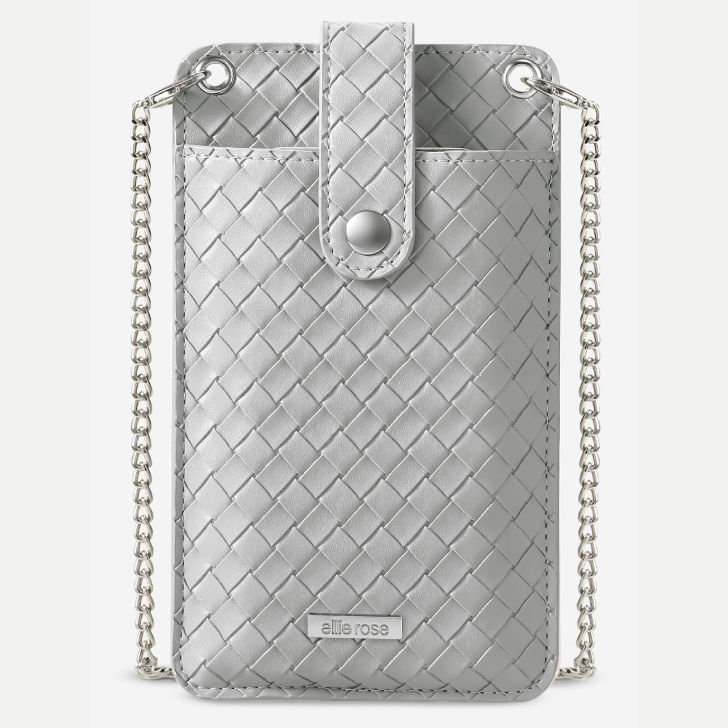 Stay chic and organised with this Silver Crossbody RFID Phone Bag — where fashion meets everyday practicality. Designed to hold your phone, cards and small essentials, it features a sleek woven faux leather finish with a detachable metal chain strap for a touch of shine.