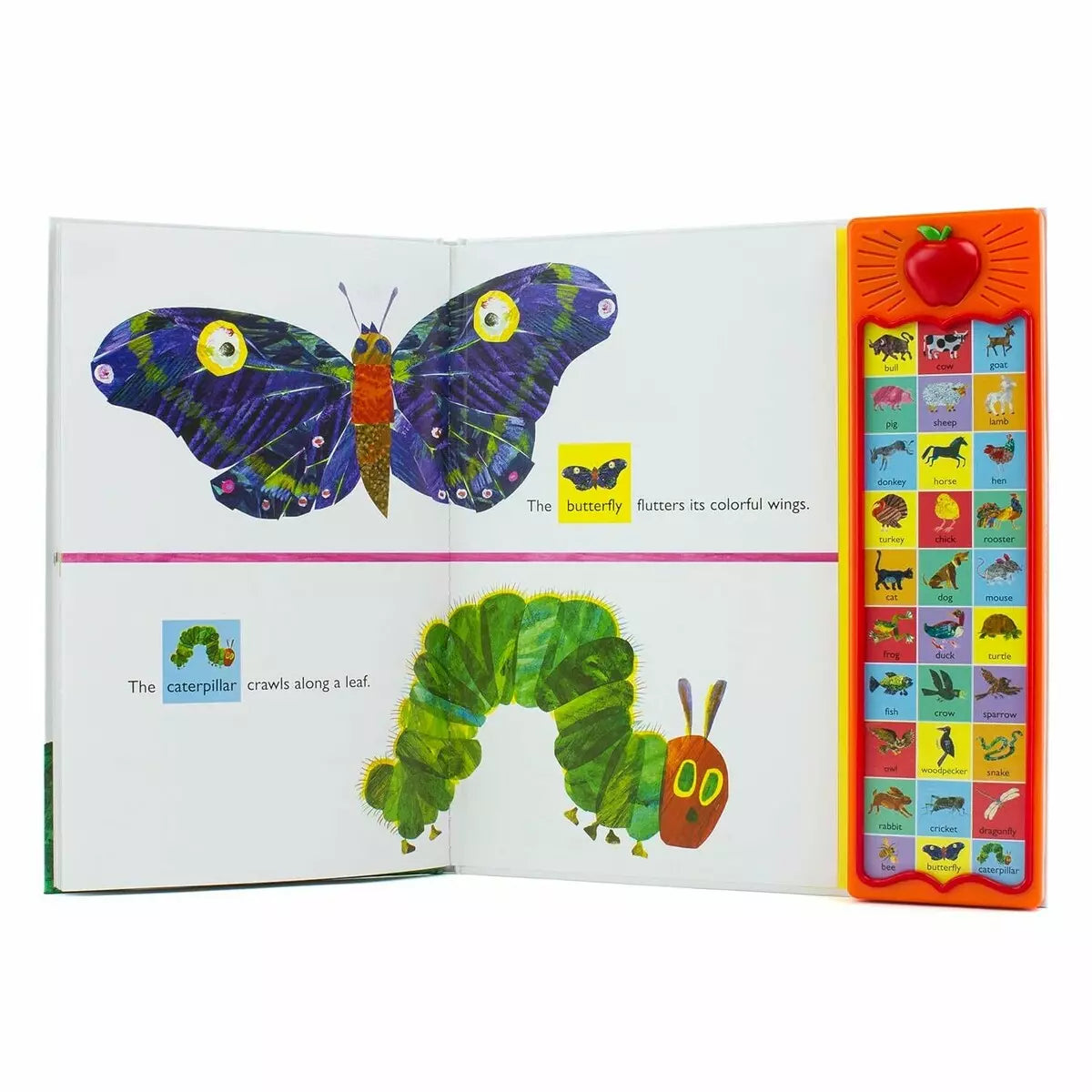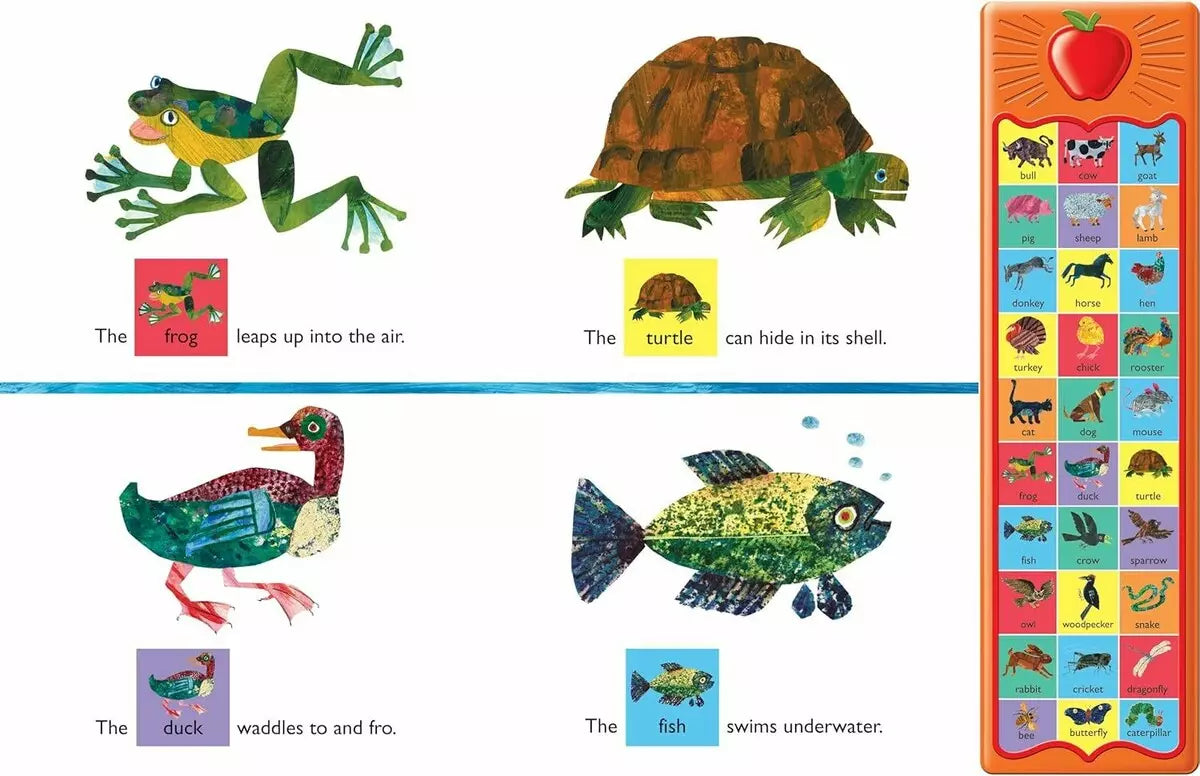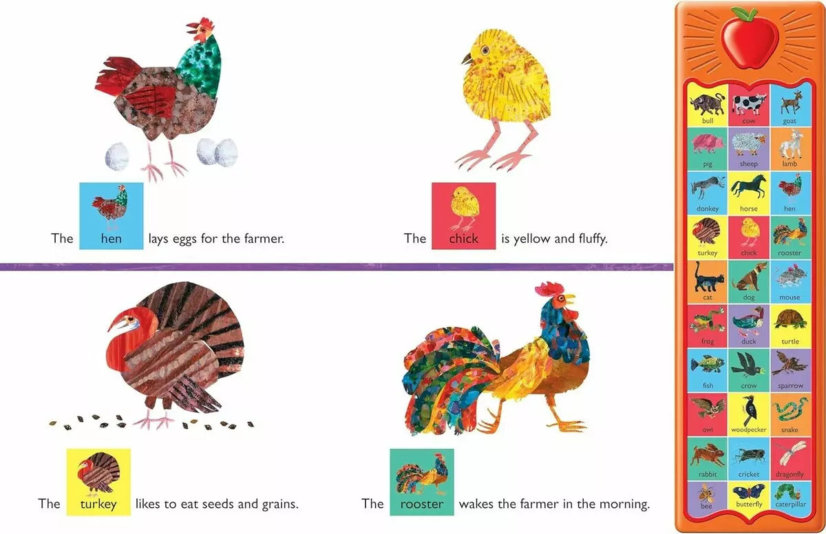 - Includes an amazing amount of animals: bull, cow, goat, pig, sheep, lamb, donkey, horse, hen, turkey, chick, rooster, cat, dog, mouse, frog, duck, turtle, fish, crow, sparrow, owl, woodpecker, snake, rabbit, cricket, dragonfly, bee, butterfly, and Eric Carle’s famous very hungry caterpillar