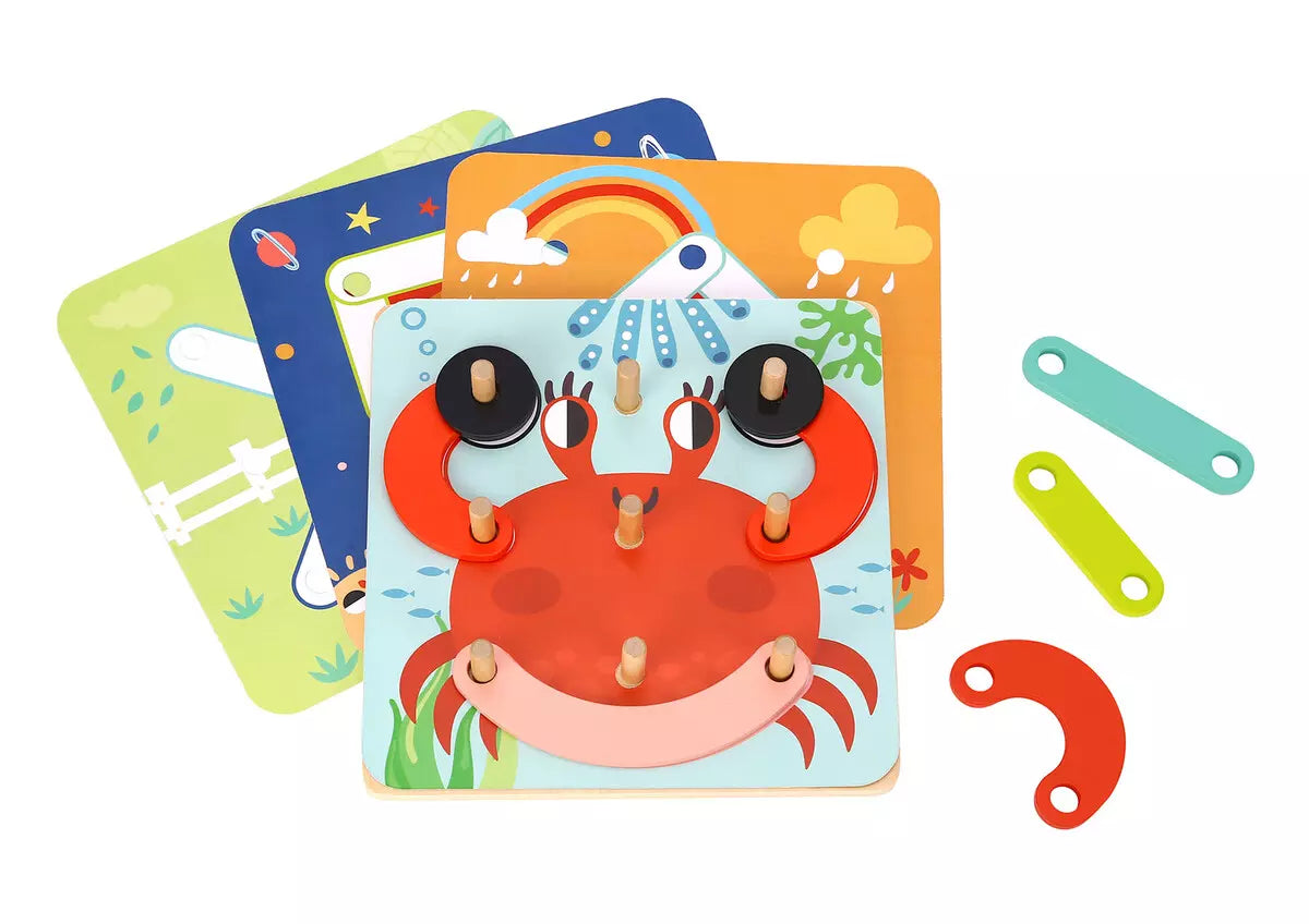 My Learning Puzzle comes with 5 double sided pattern cards, a peg board and 17 wooden shapes to thread and build with. Each wooden My Learning Puzzle from Tooky Toys is made from timber and thick cardstock and finished to the highest quality. This game is painted in child safe, non toxic paint.