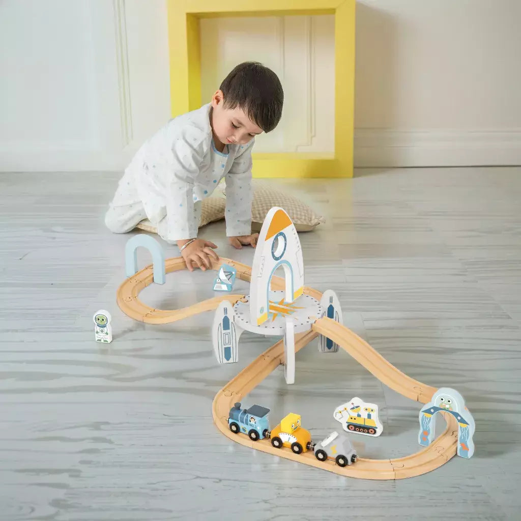 Blast off and chug away to the stars! This Space Station Train Set merges the classic railway excitement with cosmic rocket launches. Let your child explore both tracks and space, making playtime an out-of-this-world adventure.