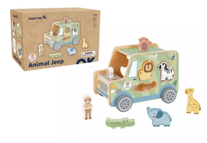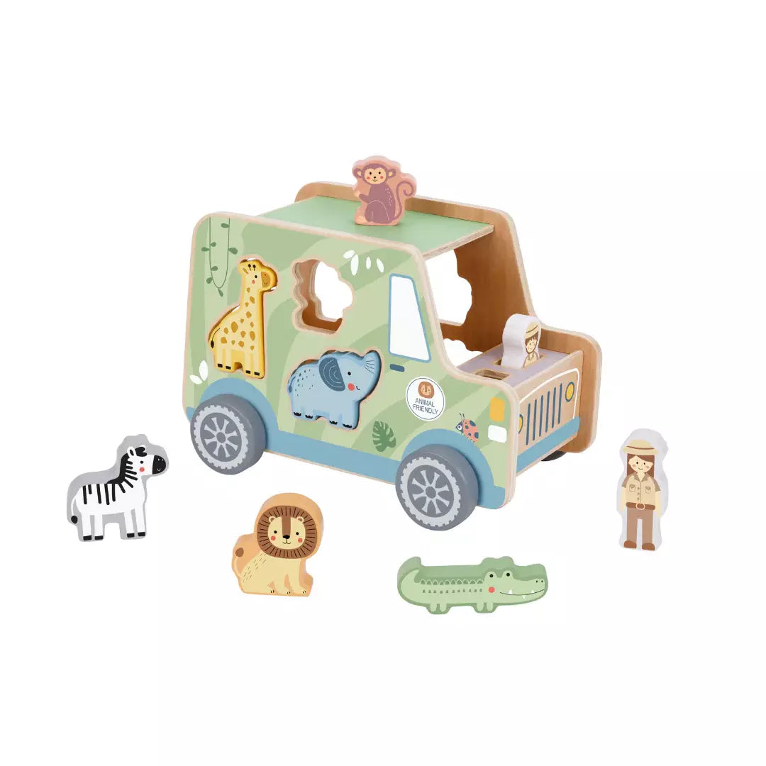 The My Forest Friends Animal Jeep by Tooky Toy is a delightful wooden shape sorting jeep that combines imaginative play with the development of fine motor skills. This rugged safari truck is steered by two cheerful animal rescue rangers, always prepared for exciting adventures across the savannah to aid their animal pals.