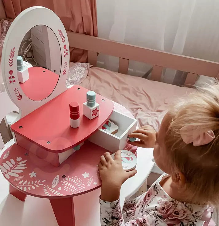 The two drawers offer a practical way for children to learn organization skills as they store the 9 included accessories, lipstick, nail polish, blush, hairbrush, hair brush, perfume, compact, and more. These accessories, made from durable materials and designed to be user-friendly for little hands, enable children to engage in imaginative and creative play scenarios. Through this play, they can mimic real-life activities, such as applying makeup and getting ready for special occasions, encouraging the development of their imagination and creativity.