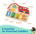 Features a variety of hands-on elements including latches, buckles, gears, beads, buttons, zippers, and shoelaces that help develop coordination, dexterity, and problem-solving skills. -
