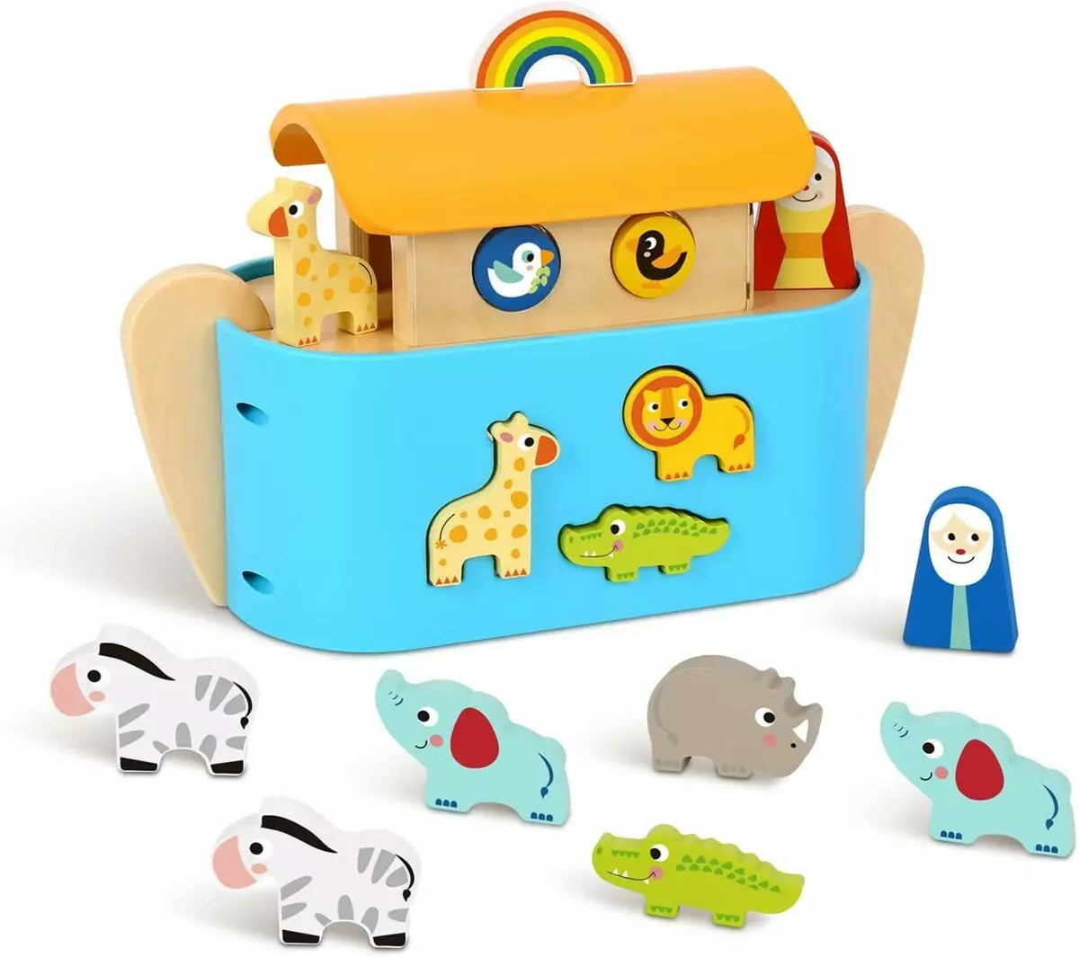 Bring the beloved story of Noahs Ark to life with the Tooky Toy Noahs Ark playset. This delightful set invites children to stack and arrange charming wooden animals inside the ark, enhancing fine motor skills through interactive cut out shapes on the boat's side.