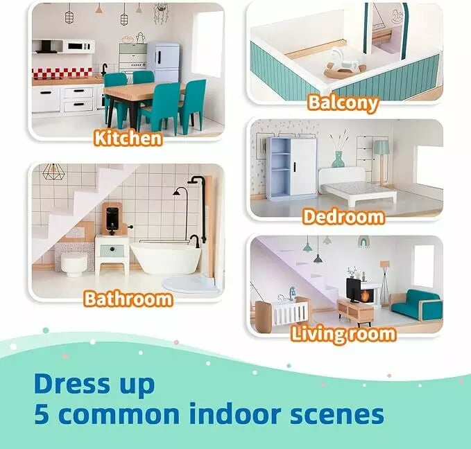 The dollhouse mansion is constructed from high-quality wood and is sturdy enough to withstand even the most enthusiastic play. It has been painted with non-toxic pastel paint, making it safe for children to play with. The set comes complete with all the necessary accessories, including furniture and decor, to bring each room to life.