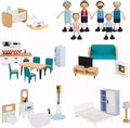 Comes with 6 figures and various furnishing accessories. The pieces are a mixture of plastic and wood.