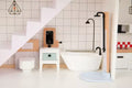 This dollhouse mansion is equipped with three levels of play, each with its own unique set of rooms and features. The first floor boasts a dining room and kitchen perfect for hosting dinner parties with the doll family's friends. The bathroom is adjacent to the kitchen/dining room, complete with bath, shower and toilet. On the second floor, there is a spacious lounge room with a cozy couch, TV and coffee table. Finally, on the third floor, there is a charming bedroom with bed, cupboard and a cot if you need it. Step outside to a balcony, perfect for enjoying the fresh air and taking in the scenic views.